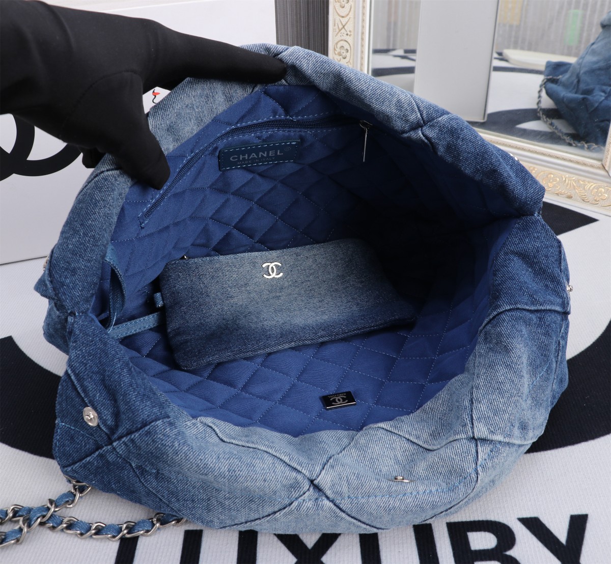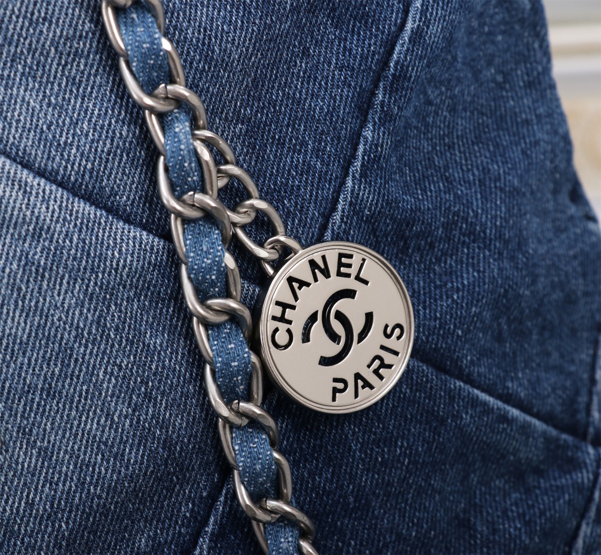 Chanel 23P 22 Bag 1162 in Denim with Washed Blue-to-White