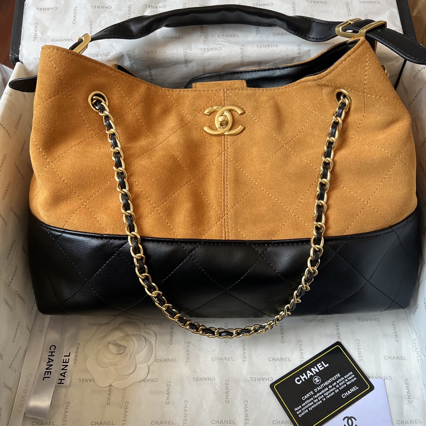 The CHANEL 25A Haute Couture collection features a simple yet elegant design, crafted from smooth, fine calfskin for a luxurious feel. The diamond pattern and classic double Cl0g0 design create a subtle, understated luxury, creating a layered look. The antiqued gold chain is adjustable, allowing you to carry it shoulder, crossbody, or by hand. The vintage-inspired texture makes it an instant hit on the street. Practical and effortless, it's versatile and suitable for everyone!