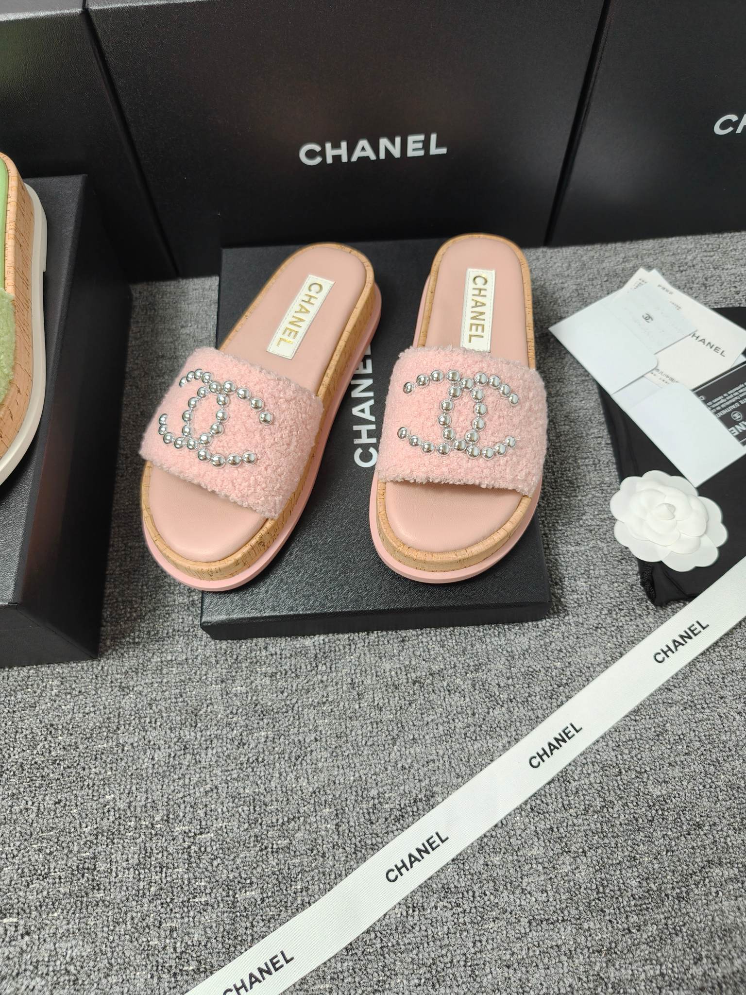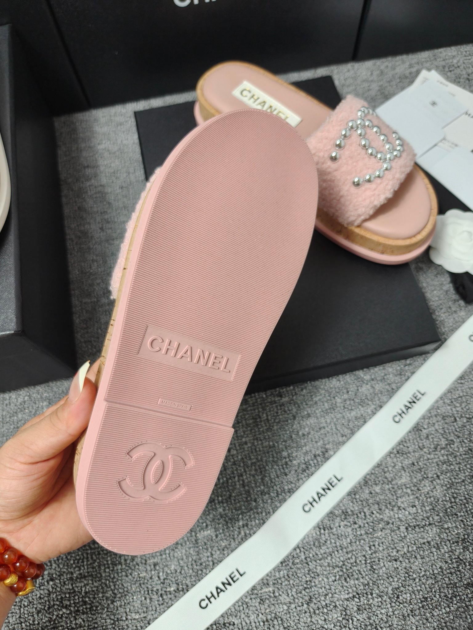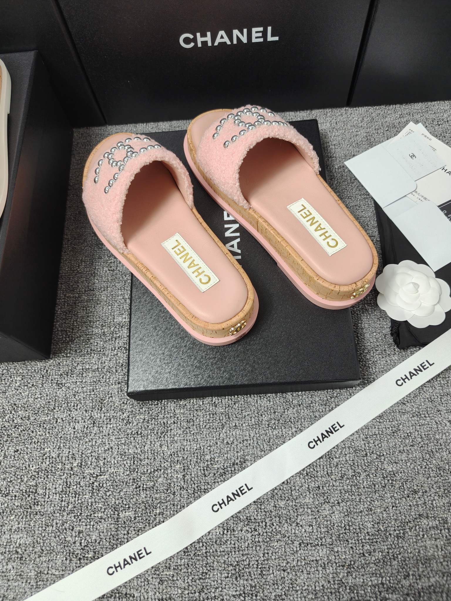 • Chanel Double C Wooden Thick Bottom Pearls Heels Slippers Sandals Shoes