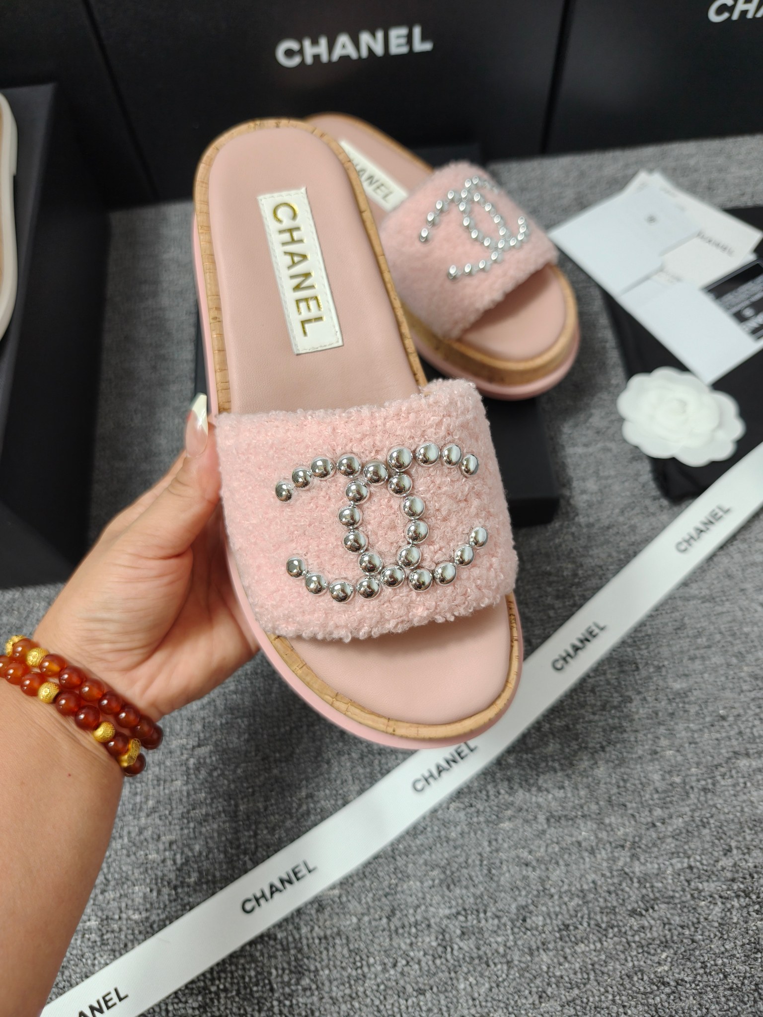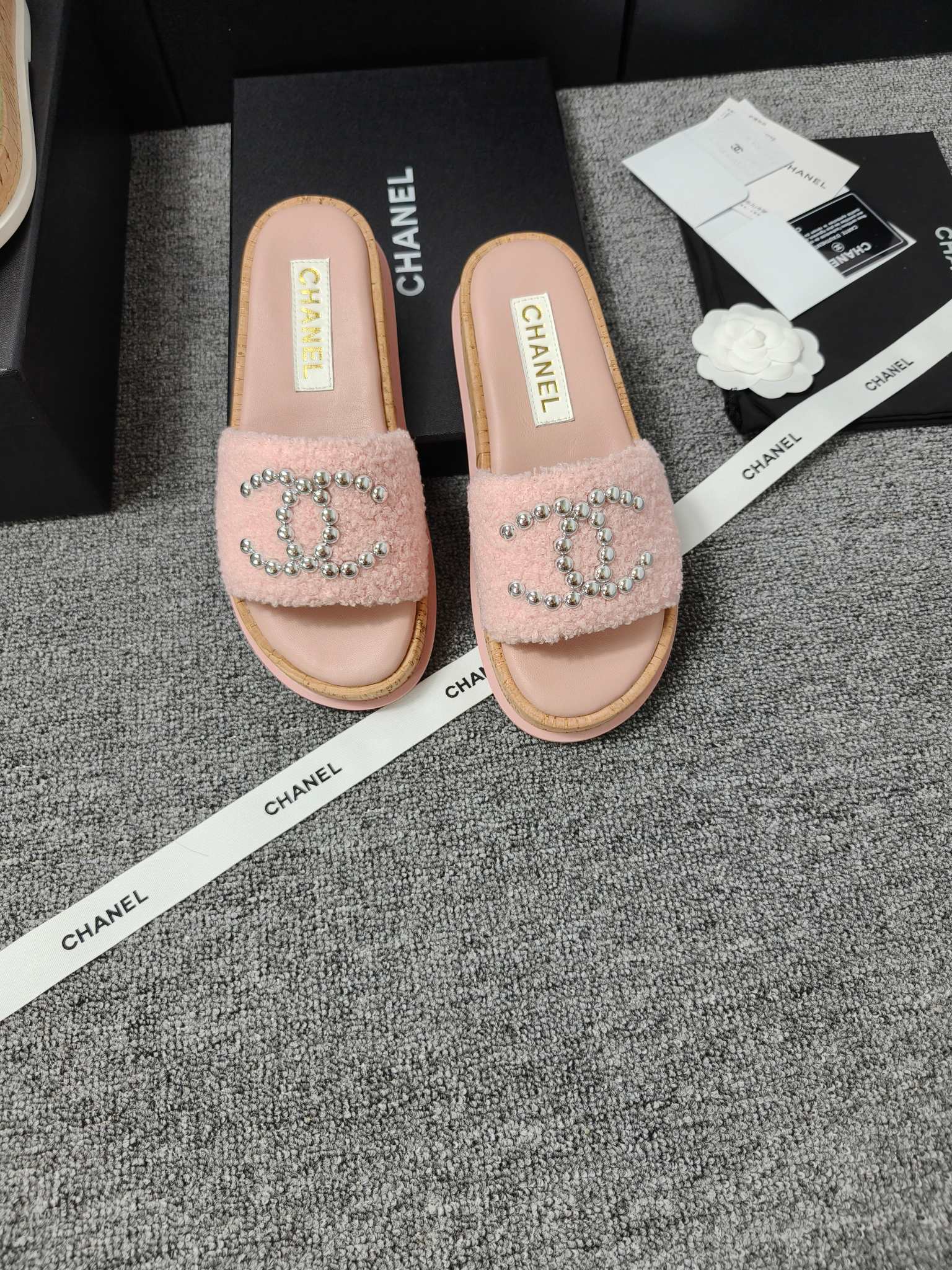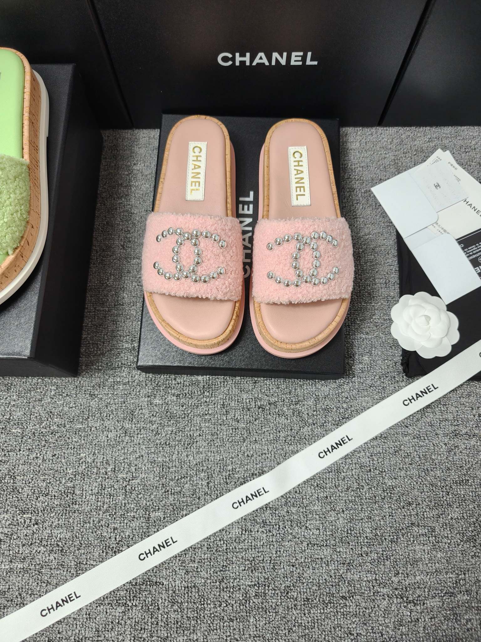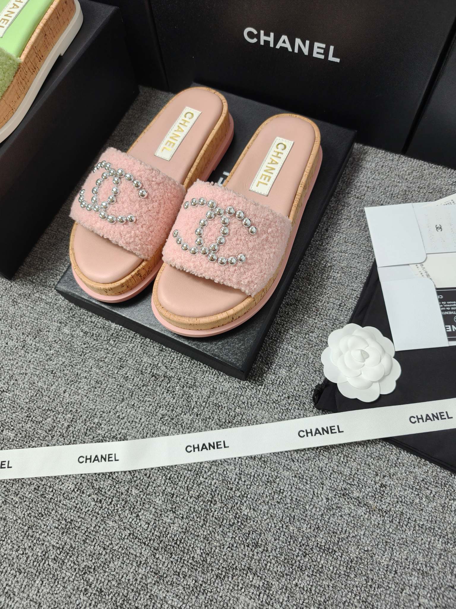 • Chanel Double C Wooden Thick Bottom Pearls Heels Slippers Sandals Shoes