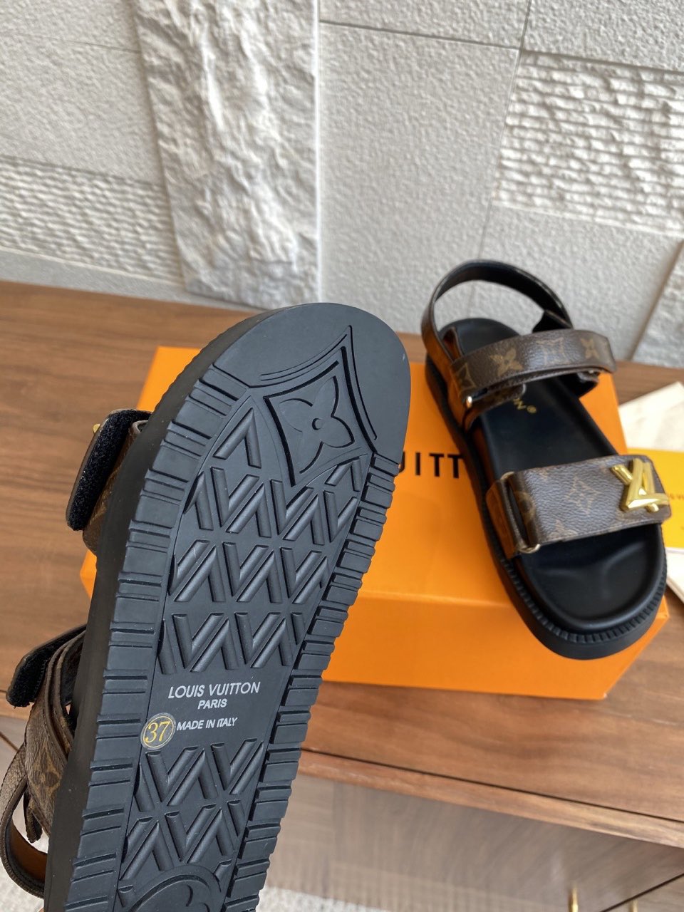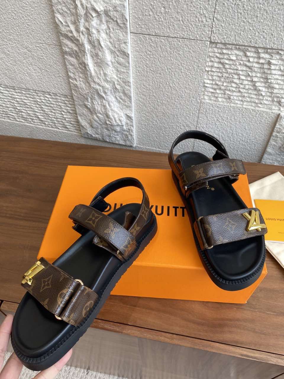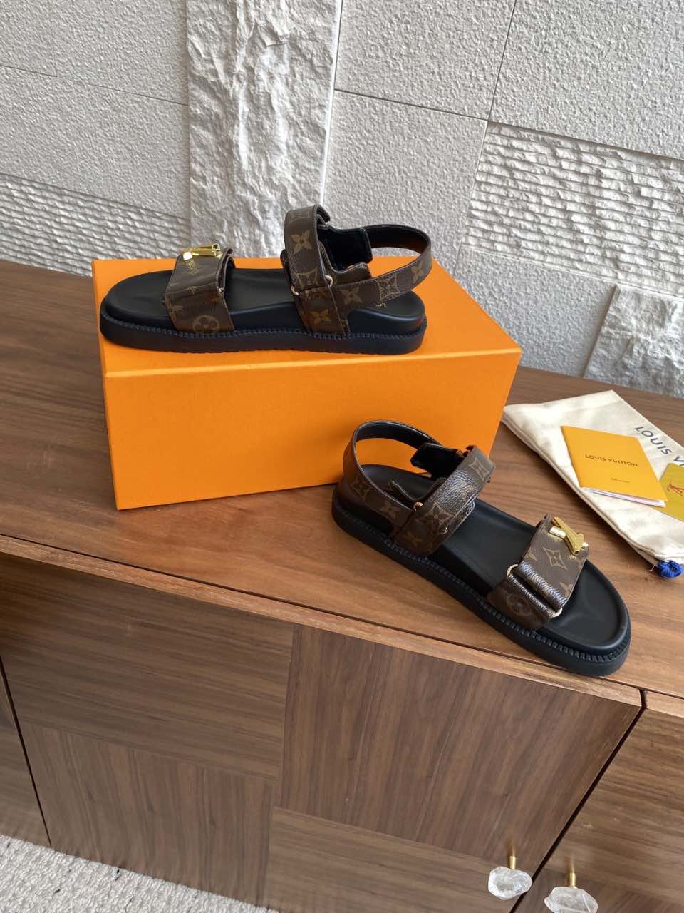 LV Louis Vuitton, this Bom Dia Comfort flat sandal is made of classic Monogram canvas, with a tough insole and non-slip rubber outsole, making the functional design trendy. One shoelace is Velcro, and the other can be adjusted with an inscribed buckle. It is delivered in exquisite packaging.