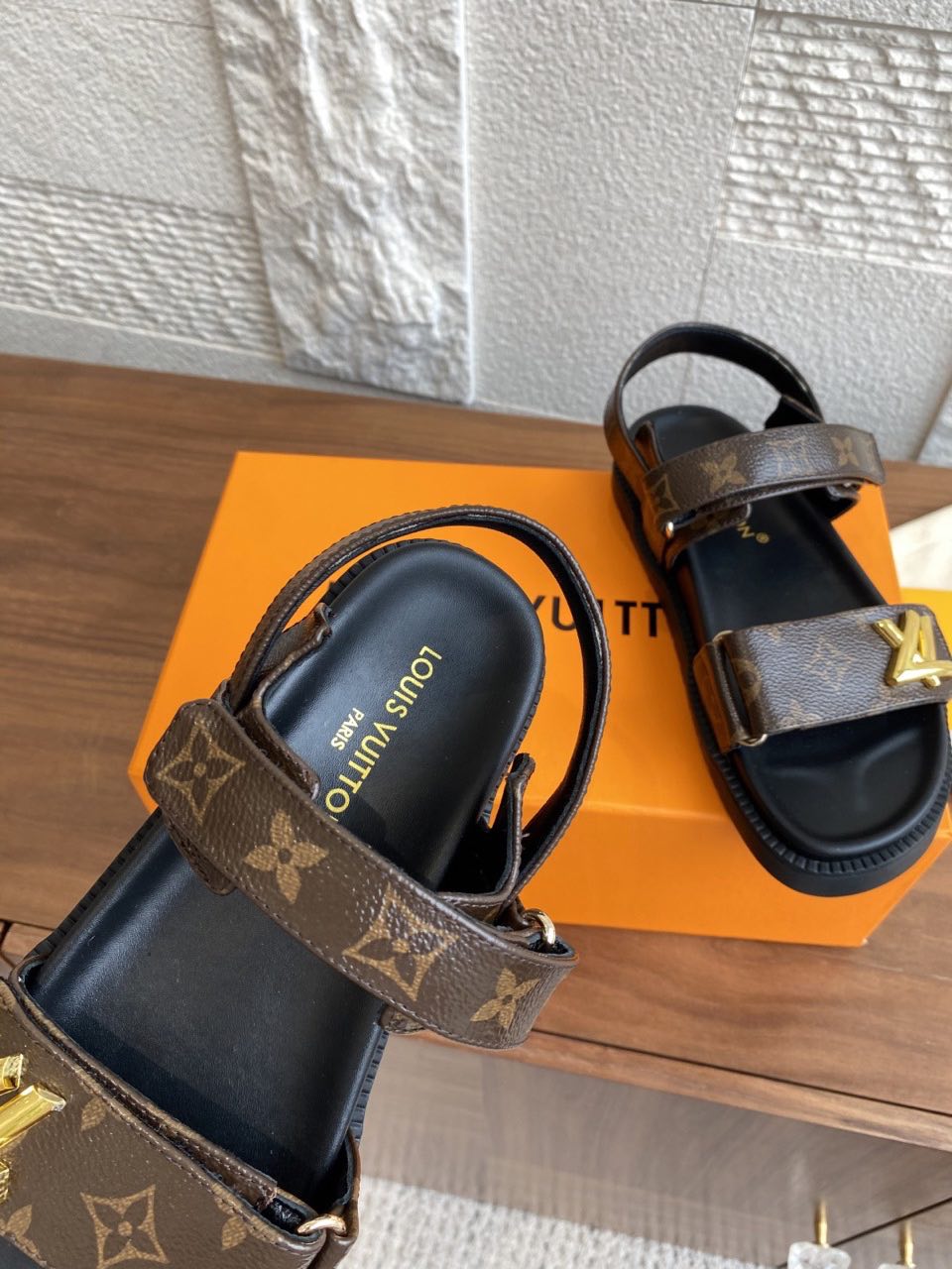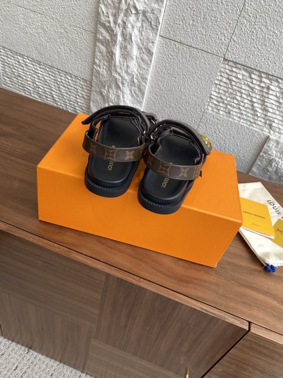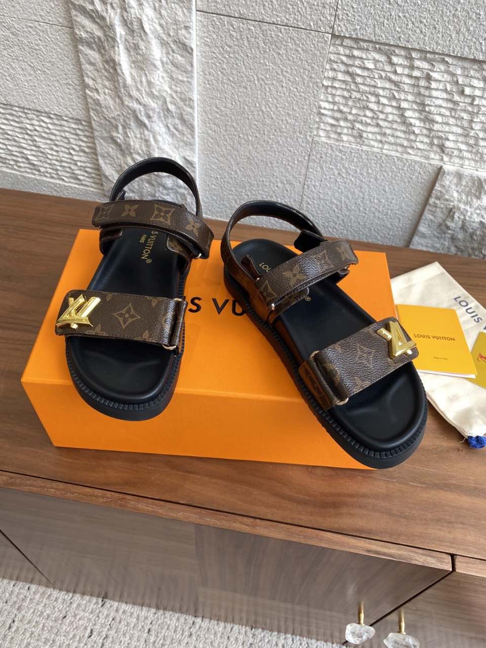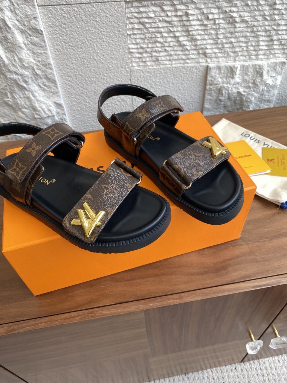 LV Louis Vuitton, this Bom Dia Comfort flat sandal is made of classic Monogram canvas, with a tough insole and non-slip rubber outsole, making the functional design trendy. One shoelace is Velcro, and the other can be adjusted with an inscribed buckle. It is delivered in exquisite packaging.