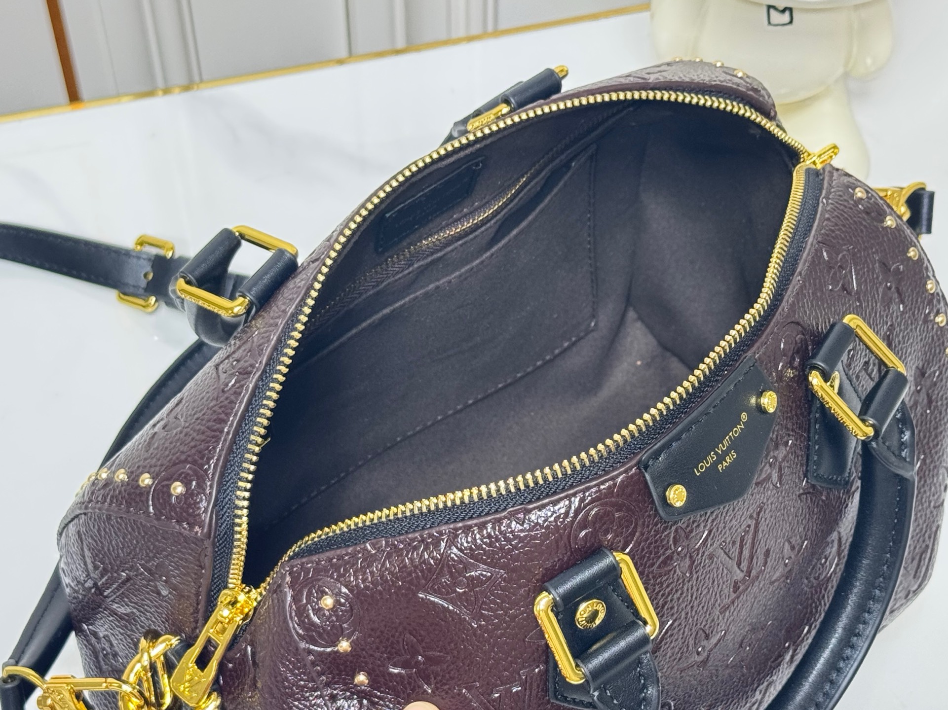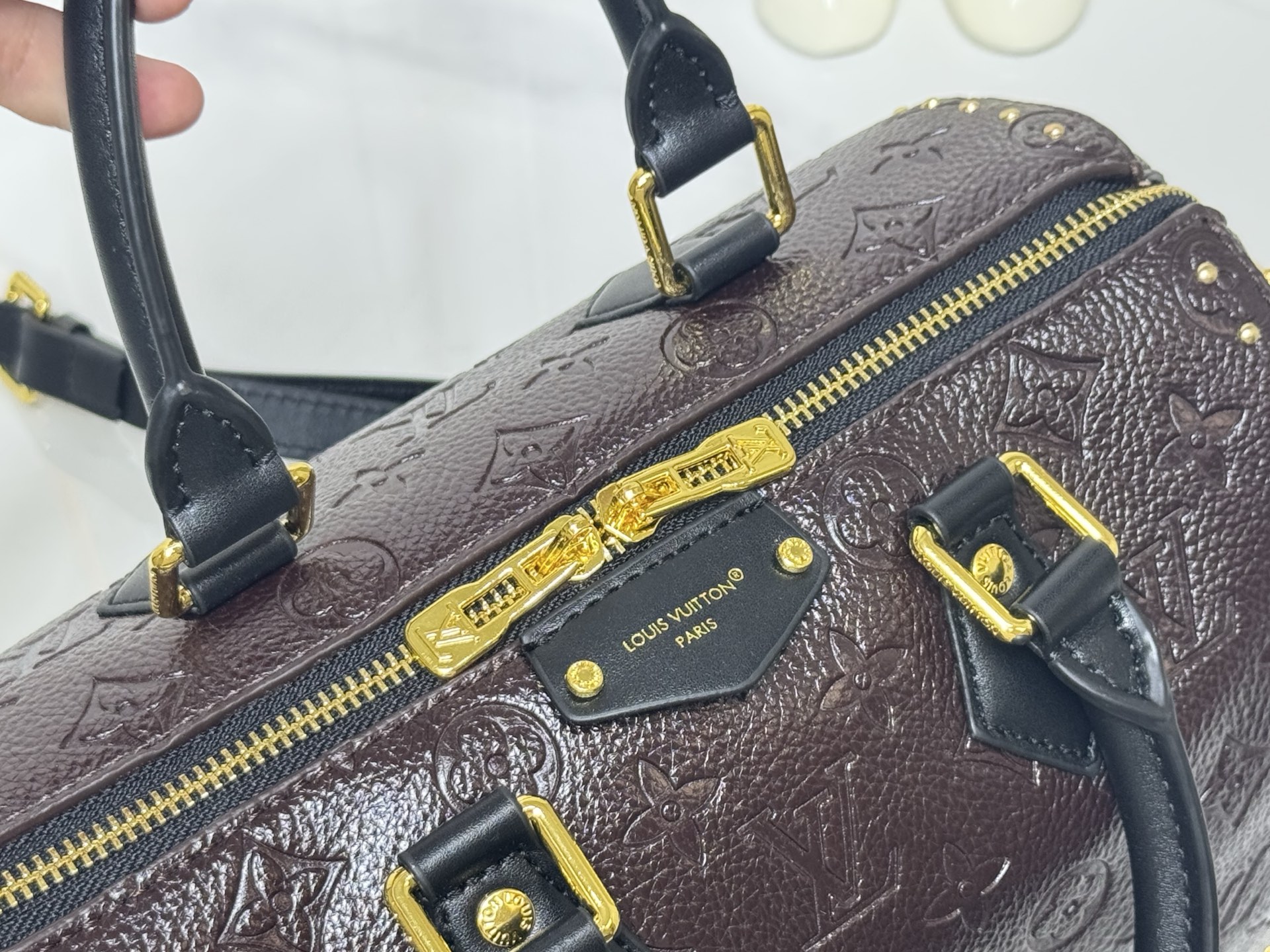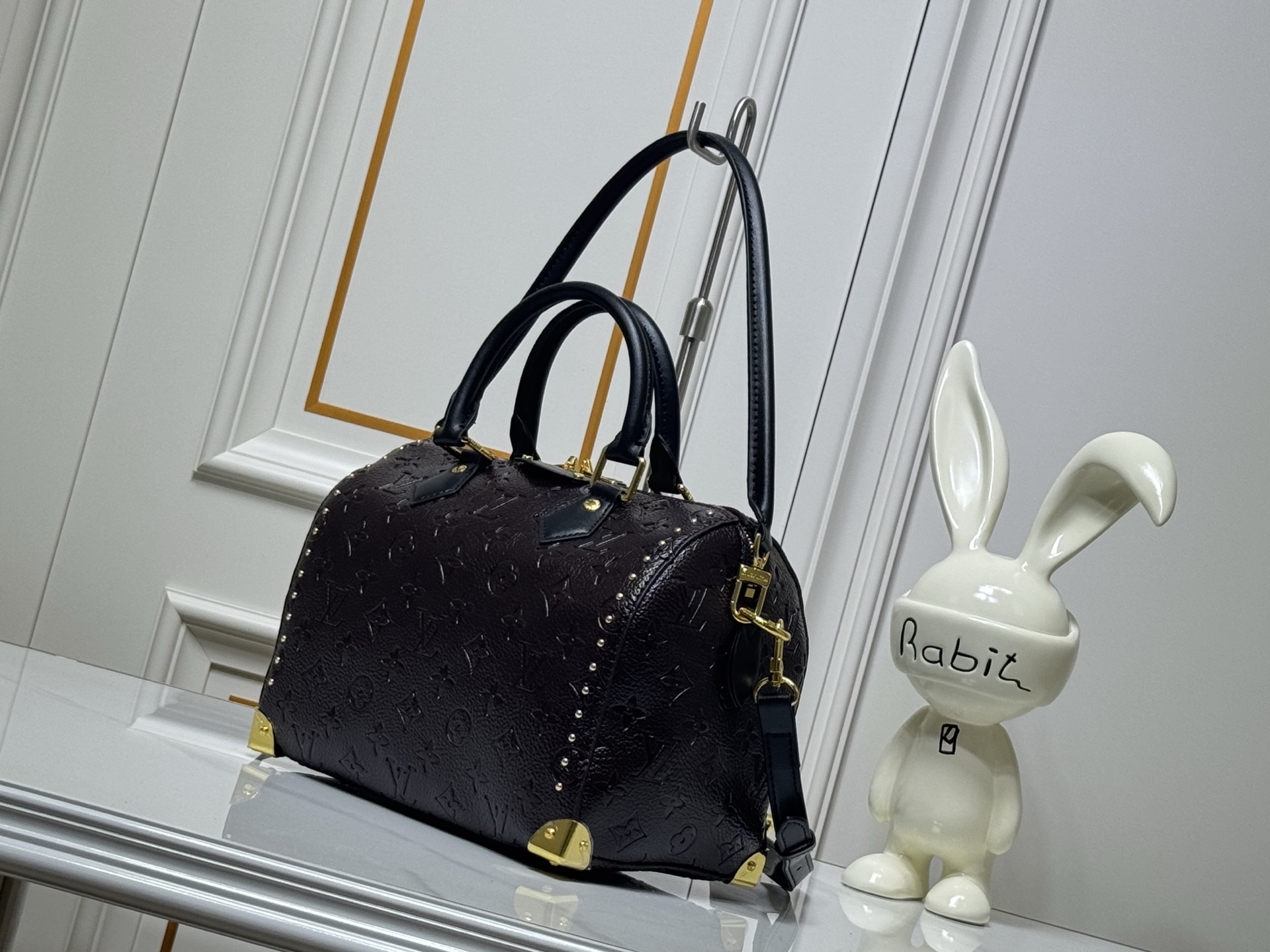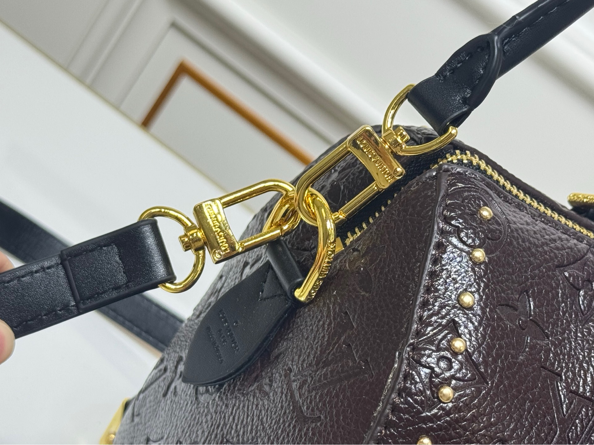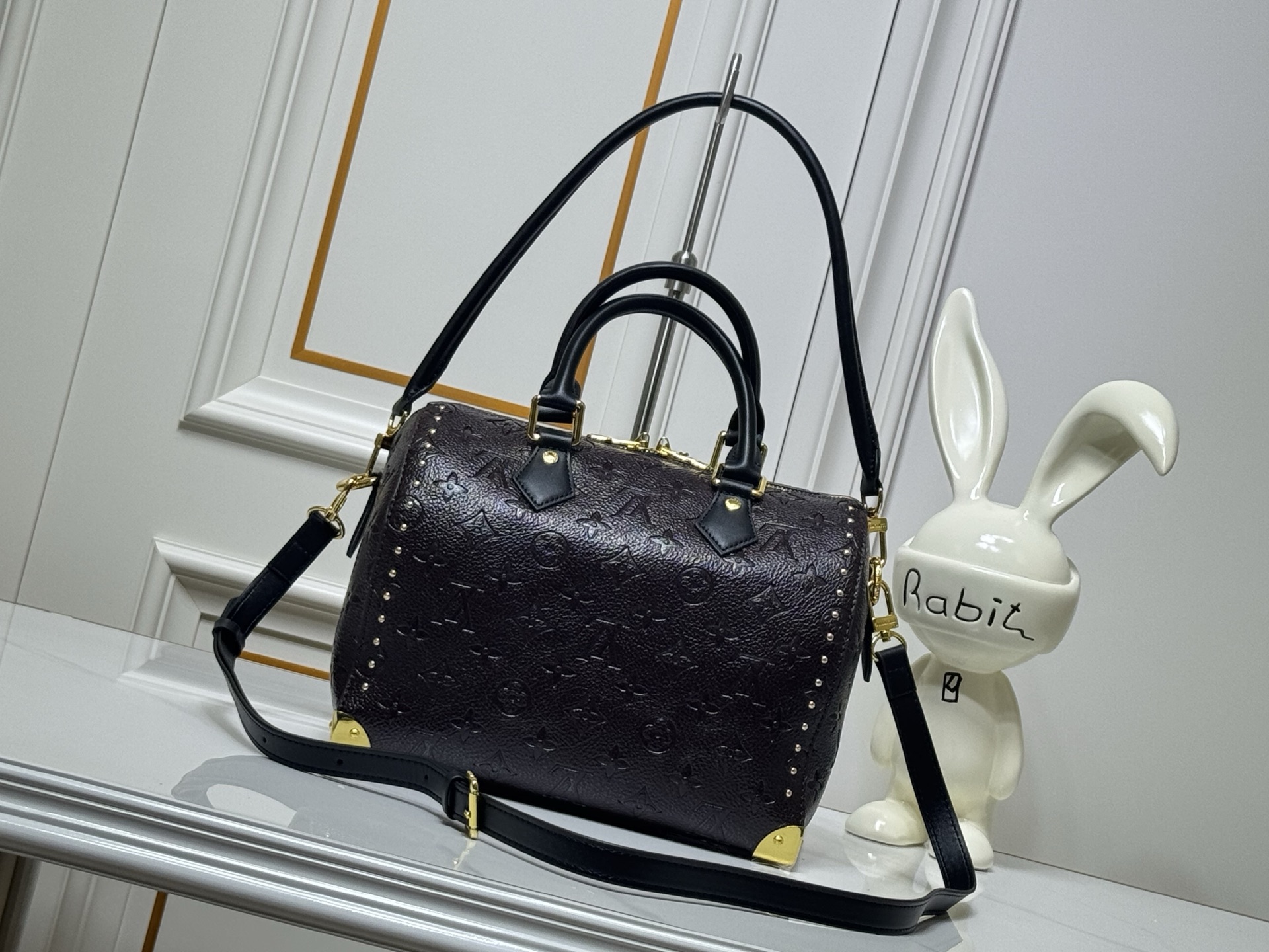 Louis Vuitton's Trunk collection welcomes the Speedy 25, a new model that pays homage to the brand's DNA with archival elements like the iconic Monogram pattern and trunk-inspired details. Constructed of canvas with cowhide leather trim and accented with metal hardware, it showcases exquisite craftsmanship. This elegant yet modern design can be carried by hand or worn crossbody, making it versatile.