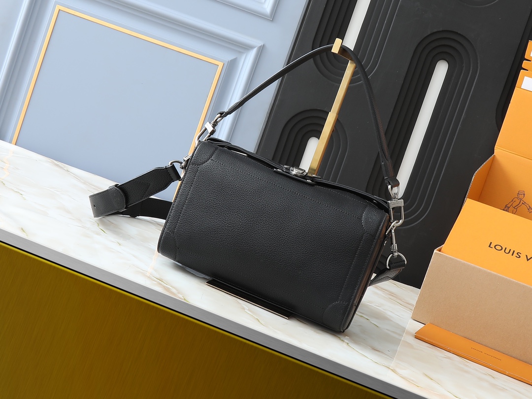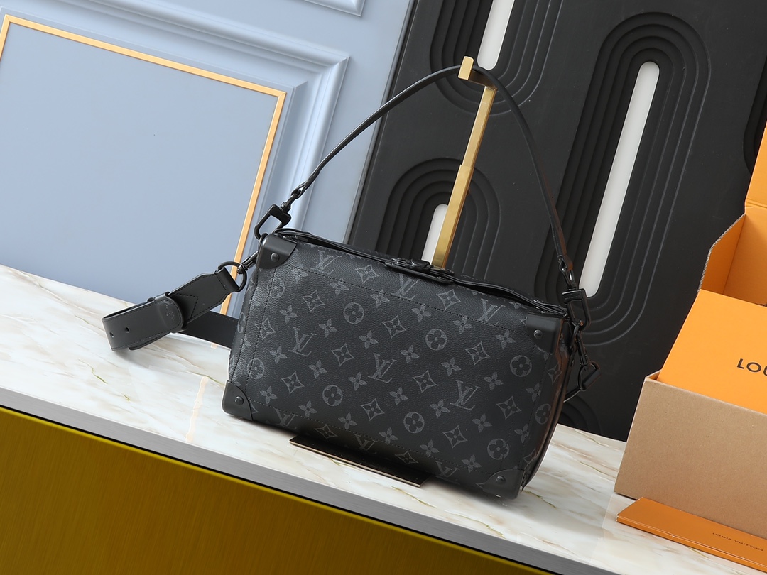 The Soul Trunk East West bag is crafted from Monogram Dust canvas and features reinforced metal corners, a nod to Pharrell Williams's heritage trunks. A magnetic closure provides easy access to the main compartment, while a detachable leather handle and a removable and adjustable shoulder strap allow for hand, shoulder, and crossbody carry.