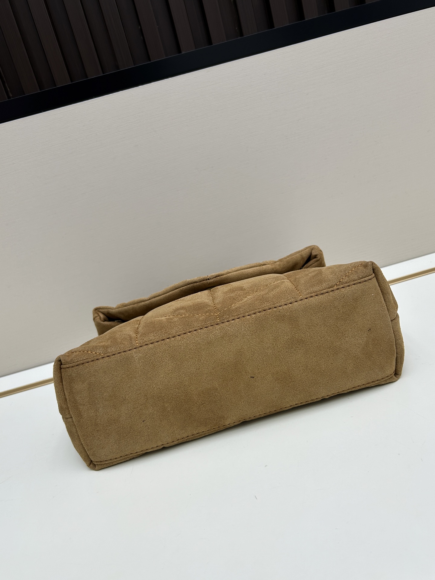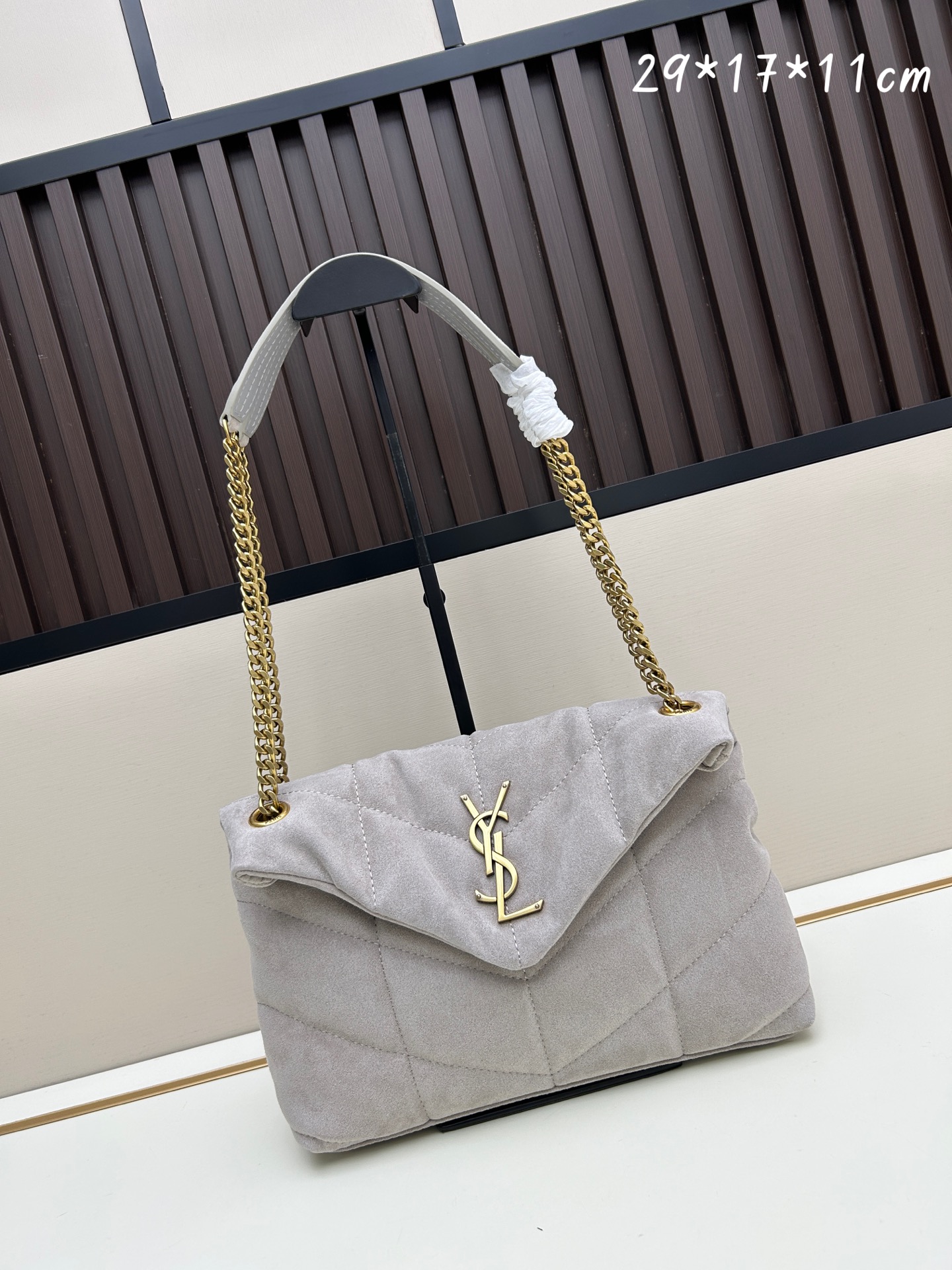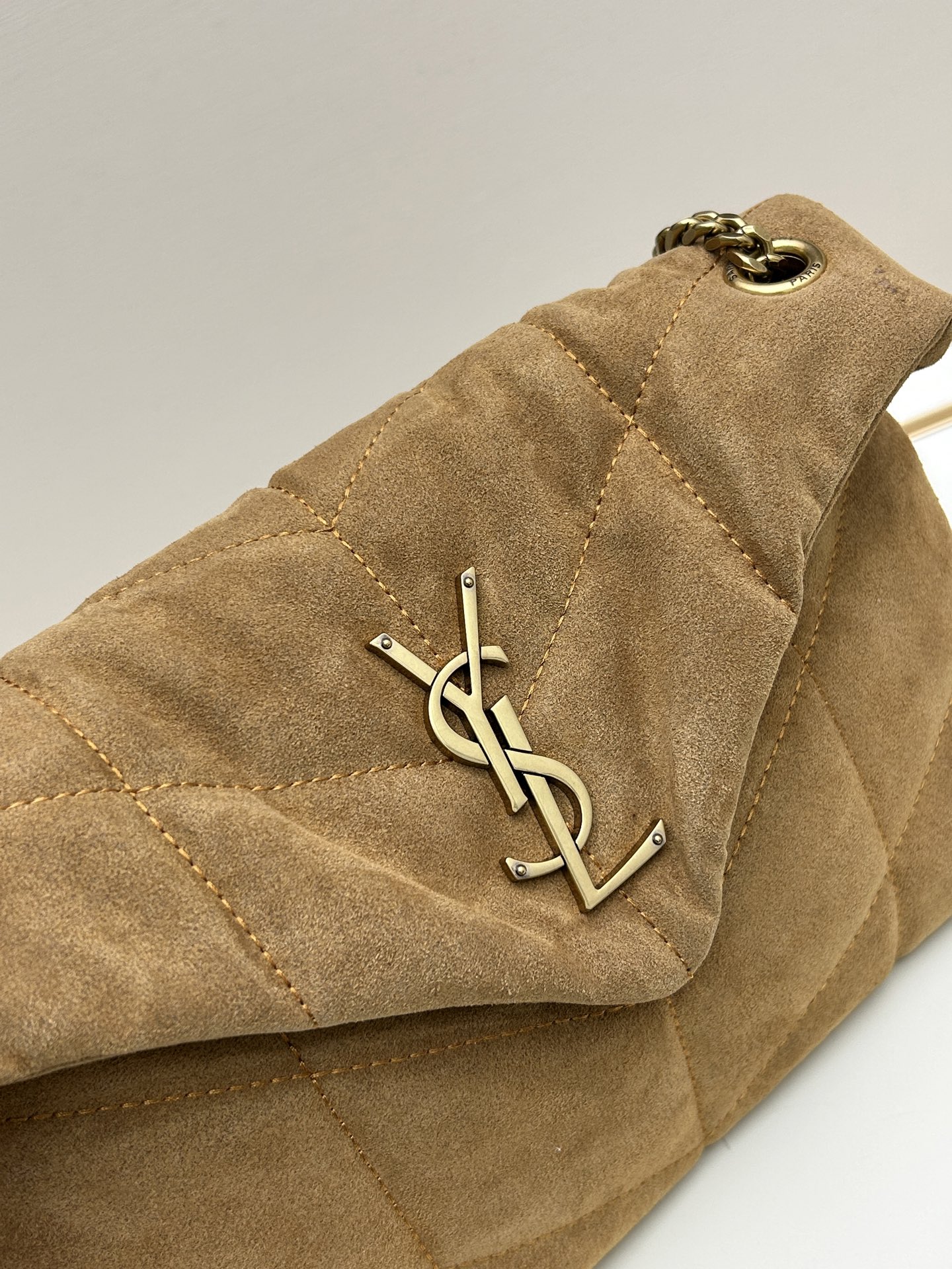 Lot 290 of this frosted LOULOU PUFFER quilted space bag is made from 100% cowhide leather, giving it a soft and delicate feel, like embracing a cloud. The classic Y logo, chain, and eyelet hardware are all made of vintage metal. The bag's opening folds over and secures with a magnetic snap closure. Inside, there's a zippered inner pocket for your phone and valuables, but no extra pockets, making it easy to use as you please!