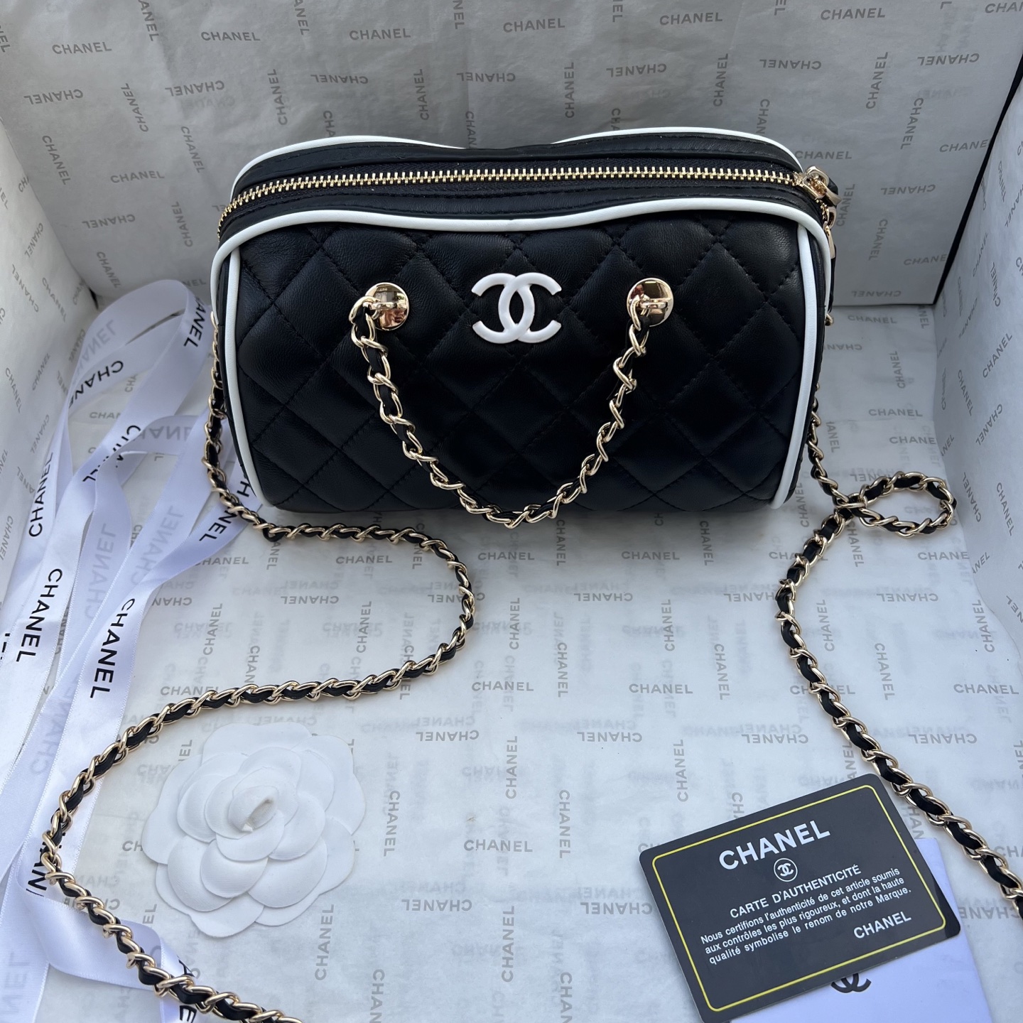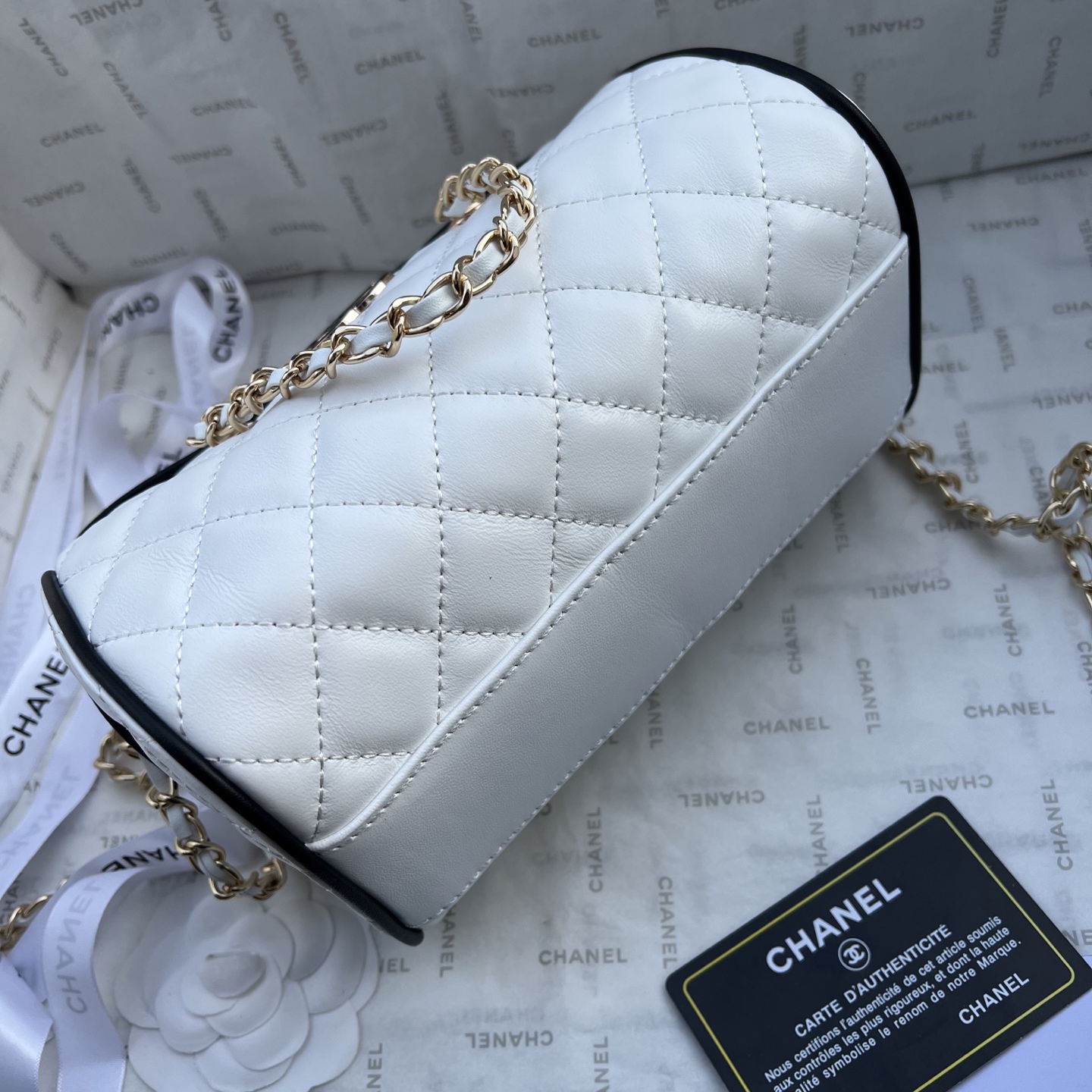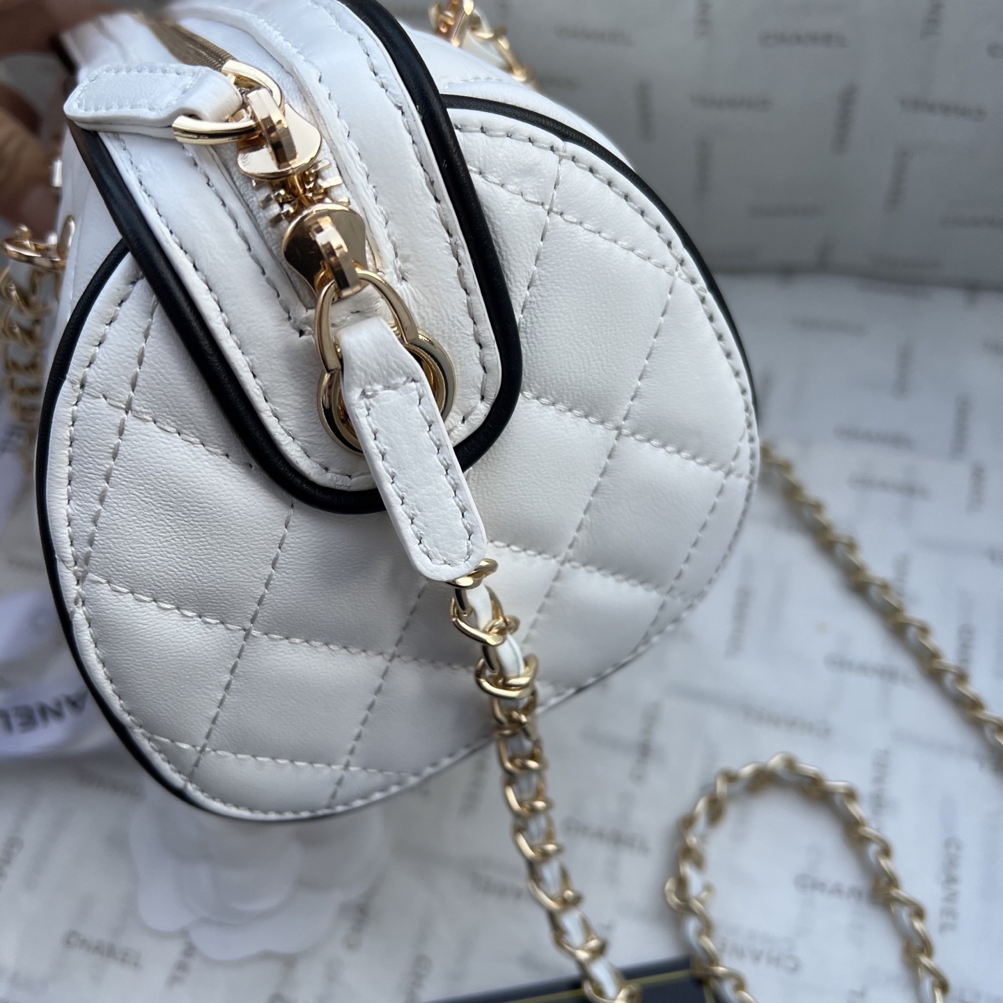 Chanel 25P Spring/Summer Bowling Collection. This 1/4 inch handbag features luxurious lambskin and a gold metal chain. Its rounded shape offers a compact size with ample storage. The long chain features a detachable, adjustable buckle. It's both cute and practical!