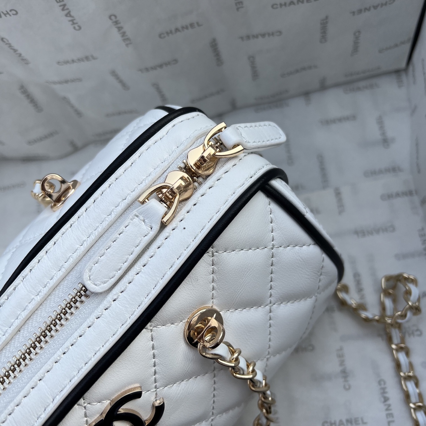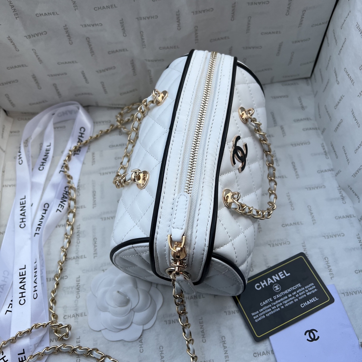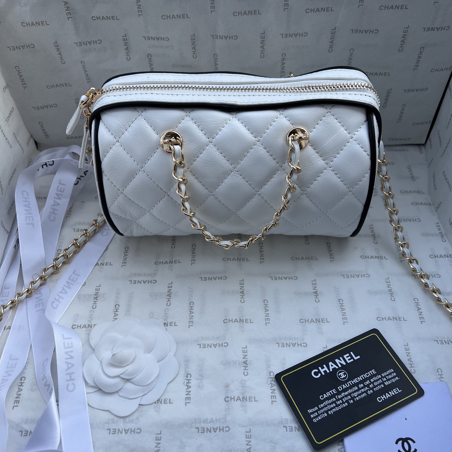 Chanel 25P Spring/Summer Bowling Collection. This 1/4 inch handbag features luxurious lambskin and a gold metal chain. Its rounded shape offers a compact size with ample storage. The long chain features a detachable, adjustable buckle. It's both cute and practical!