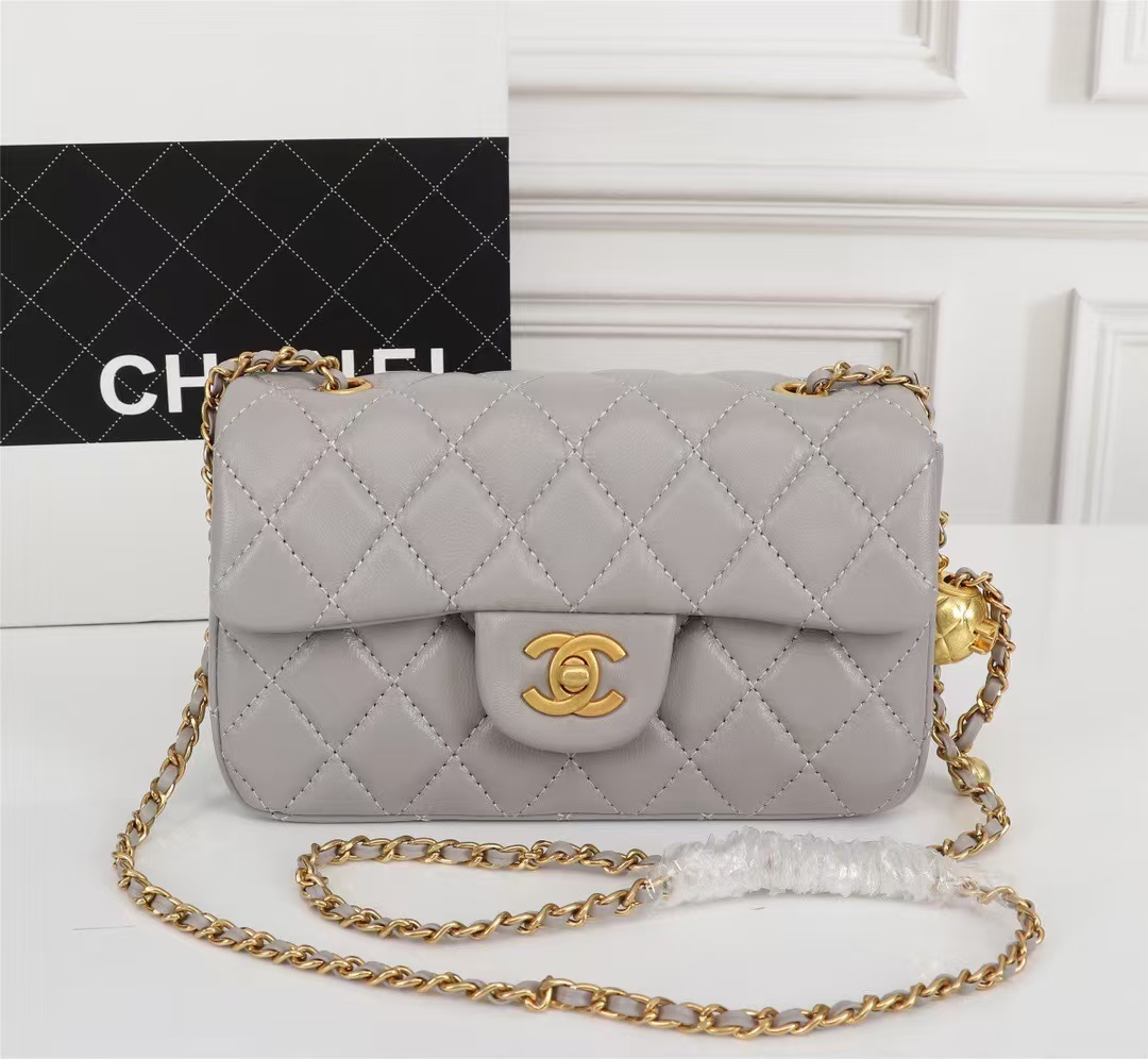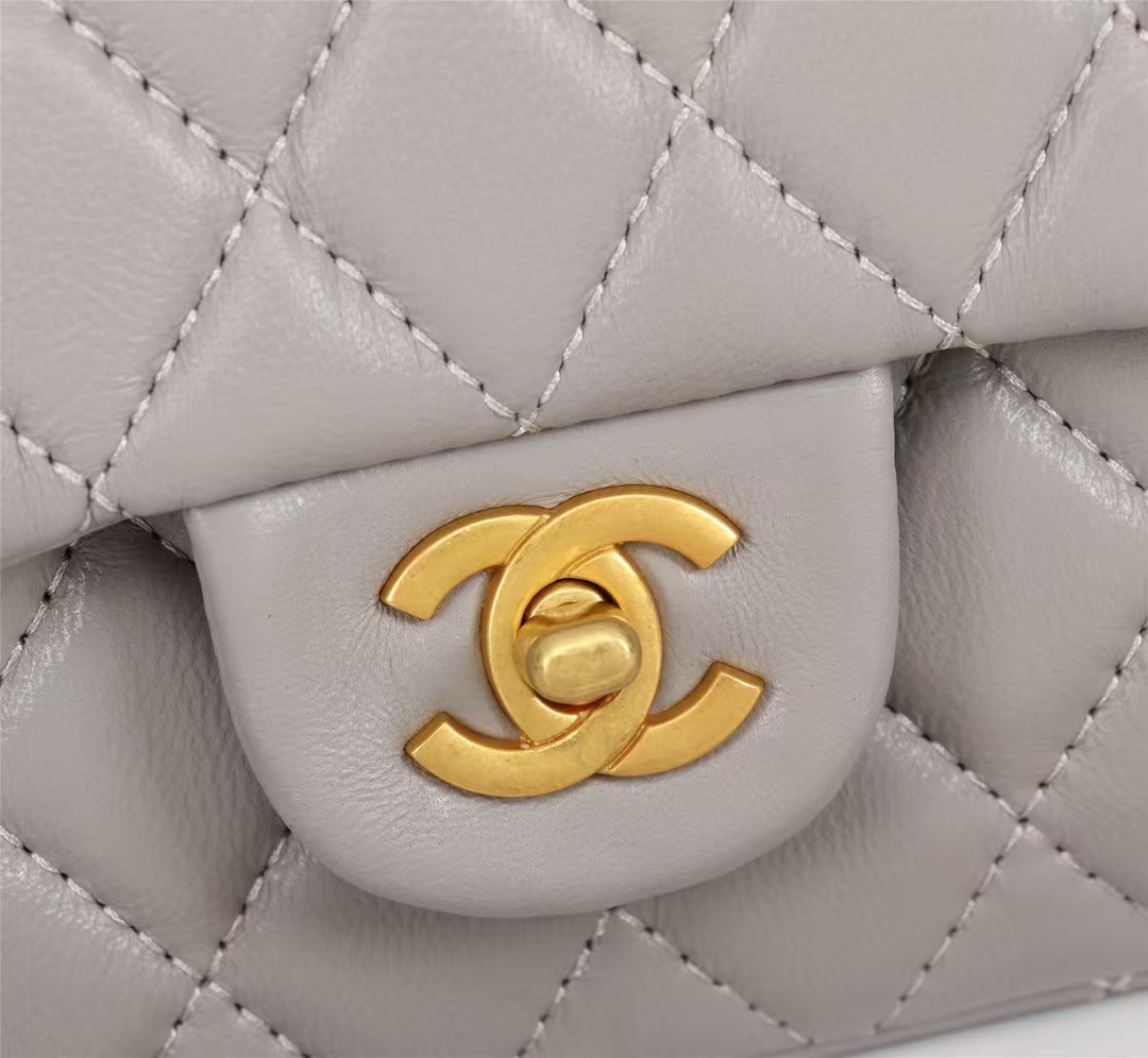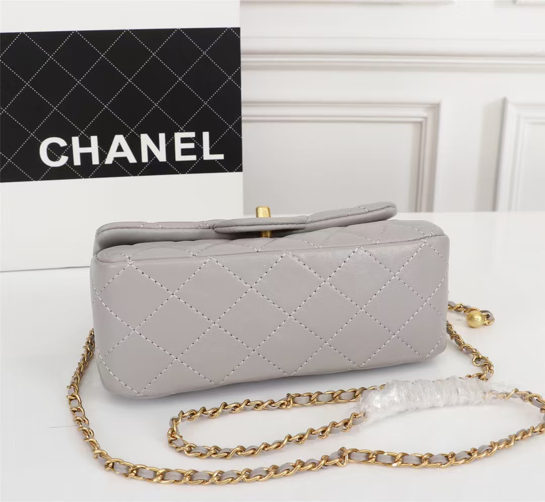 • Chanel Classic Flag Bag Pearl Crush Mini Rectangular Flap Bag Light Grey Antique Gold Hardware