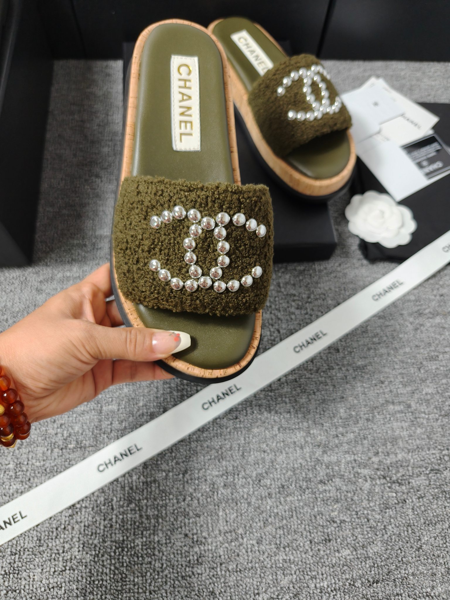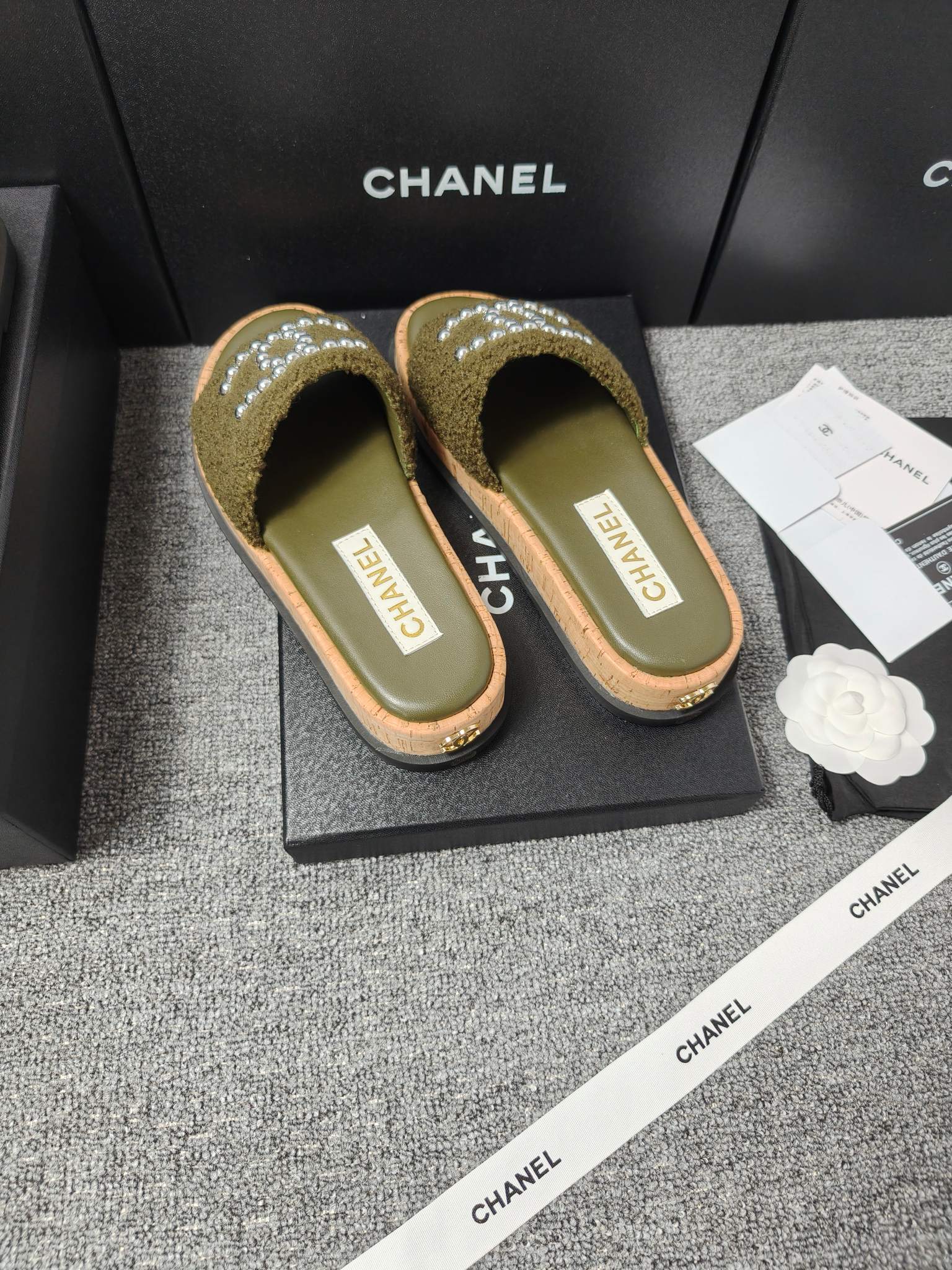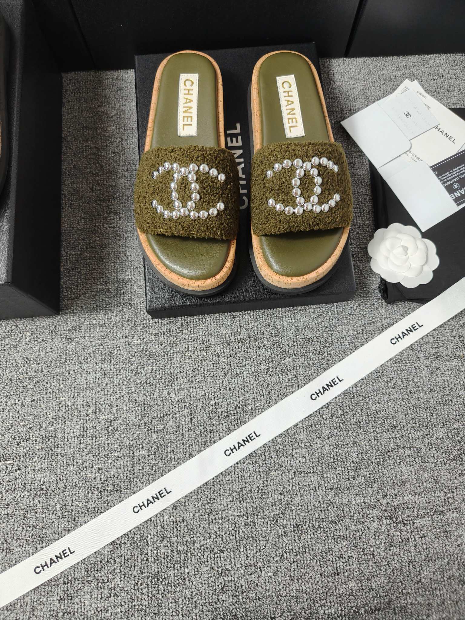 Chanel Double C Wooden Thick Bottom Pearls Heels Slippers Sandals Shoes