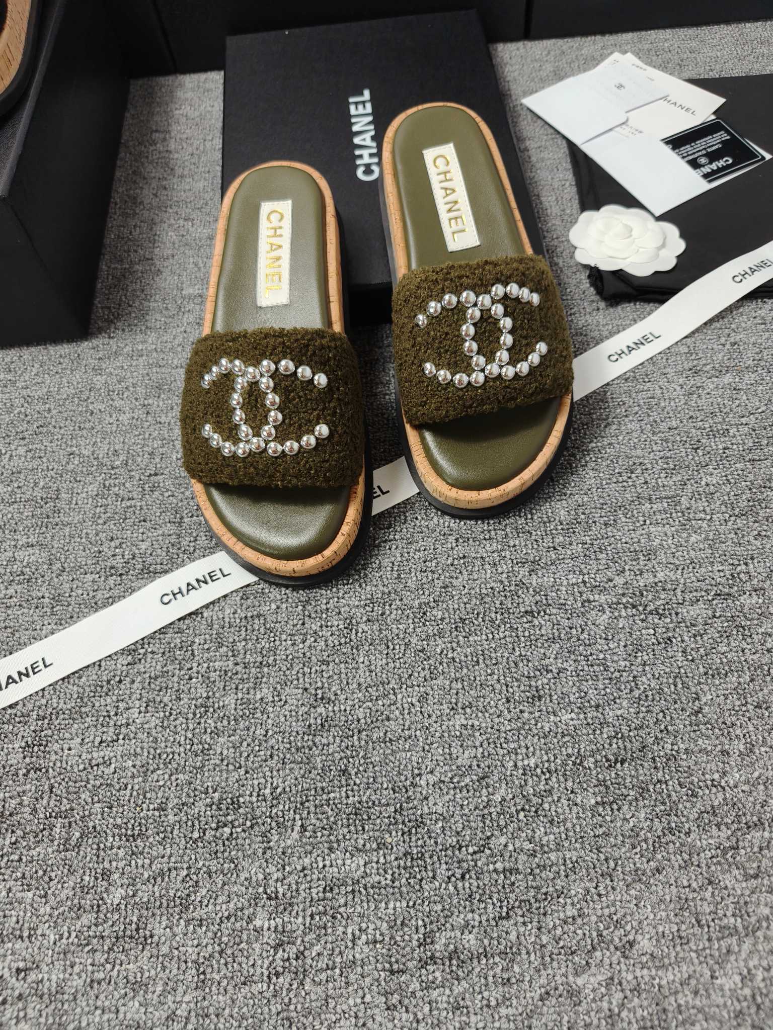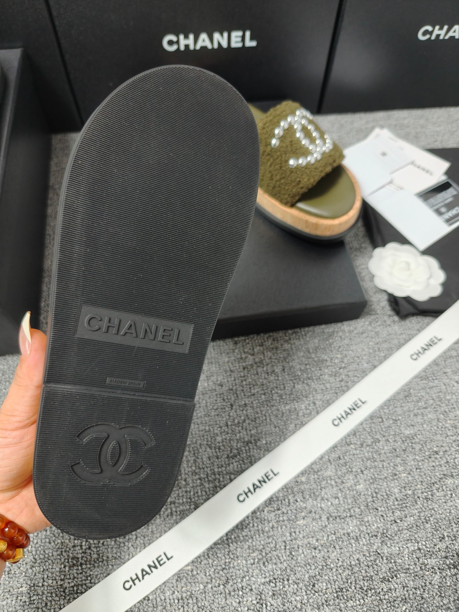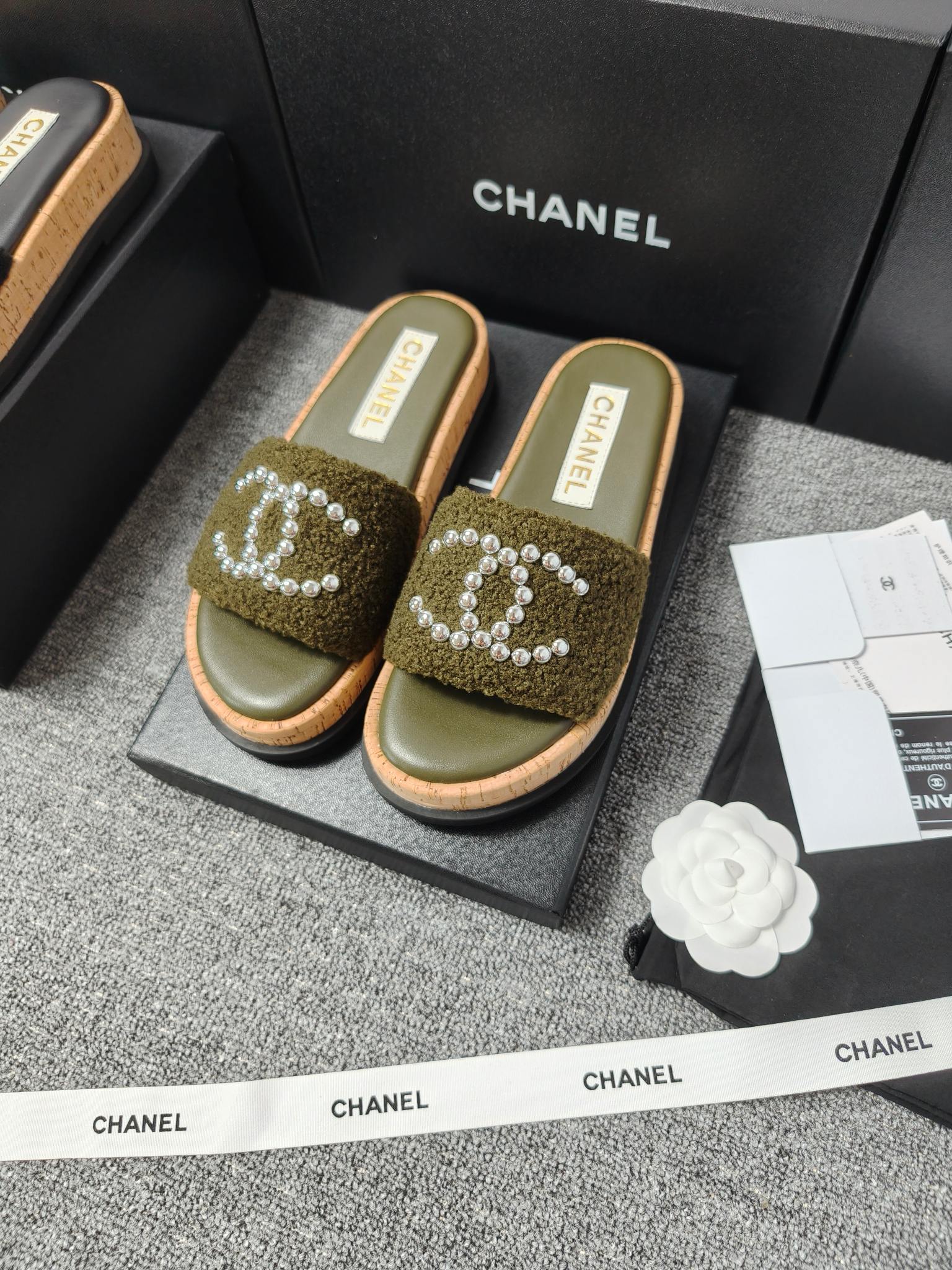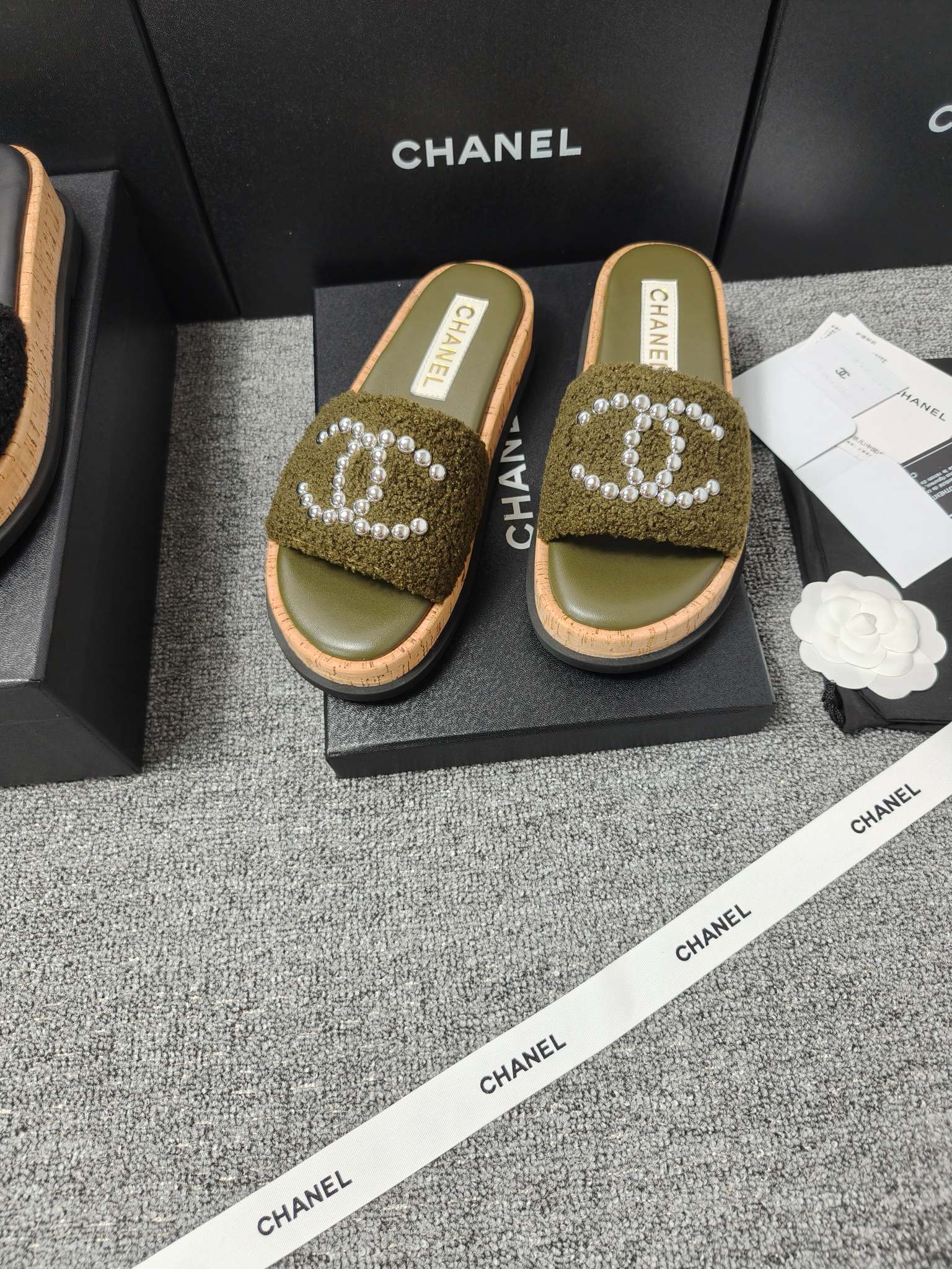 Chanel Double C Wooden Thick Bottom Pearls Heels Slippers Sandals Shoes