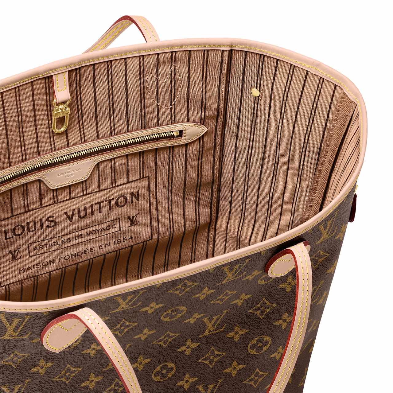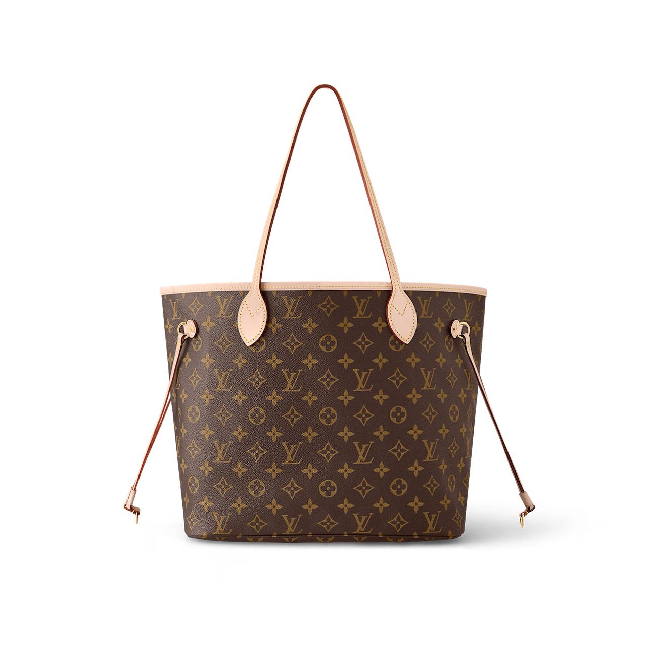 The Neverfull MM tote unites timeless design with heritage details. Made from supple Monogram canvas with natural cowhide trim, it is roomy yet not bulky, with side laces that cinch for a sleek allure or loosen for a casual look. Slim, comfortable handles slip easily over the shoulder or arm. Lined in colorful textile, it features a removable pouch which can be used as a clutch or an extra pocket.