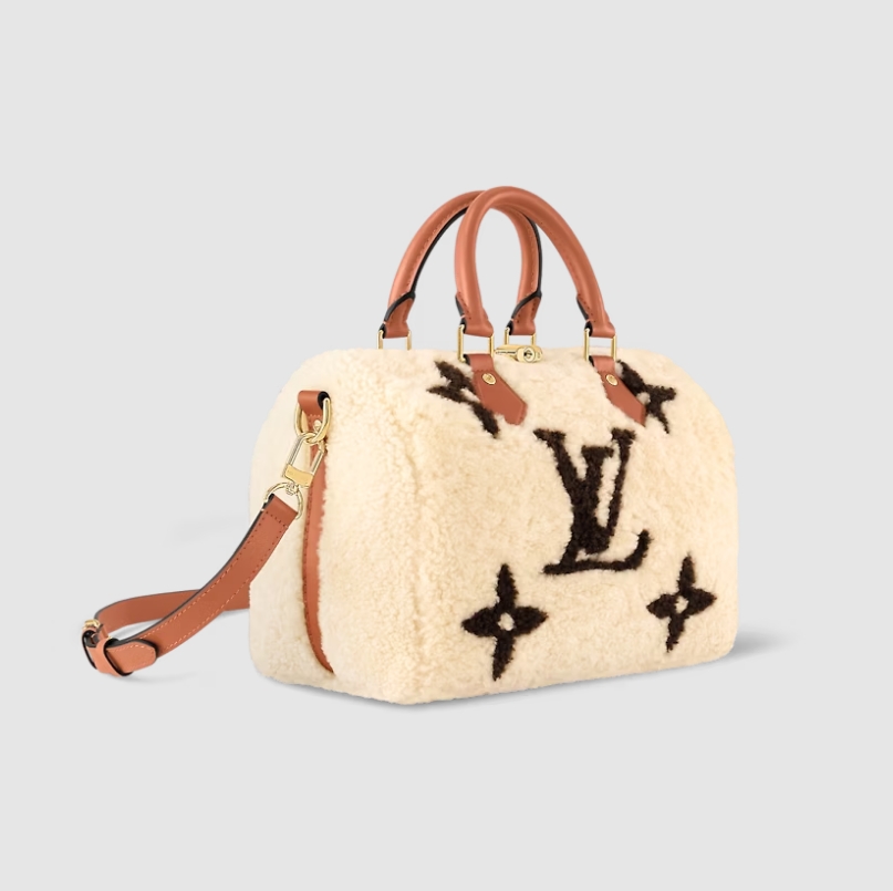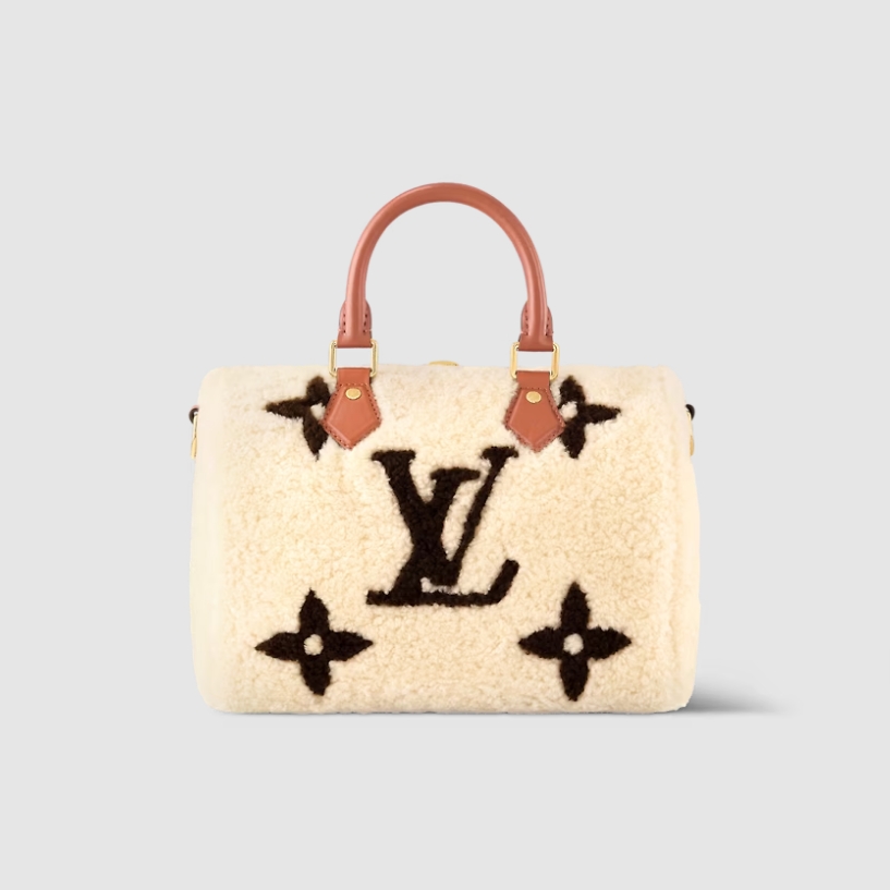 The Speedy Bandoulière 25 gets a wintry makeover with this version crafted from soft shearling with grained-leather trim. The Giant Monogram pattern is achieved with a sophisticated intarsia technique that mixes two different colors of shearling. Two rolled-leather top handles and a leather shoulder strap – removable and adjustable – make it versatile.