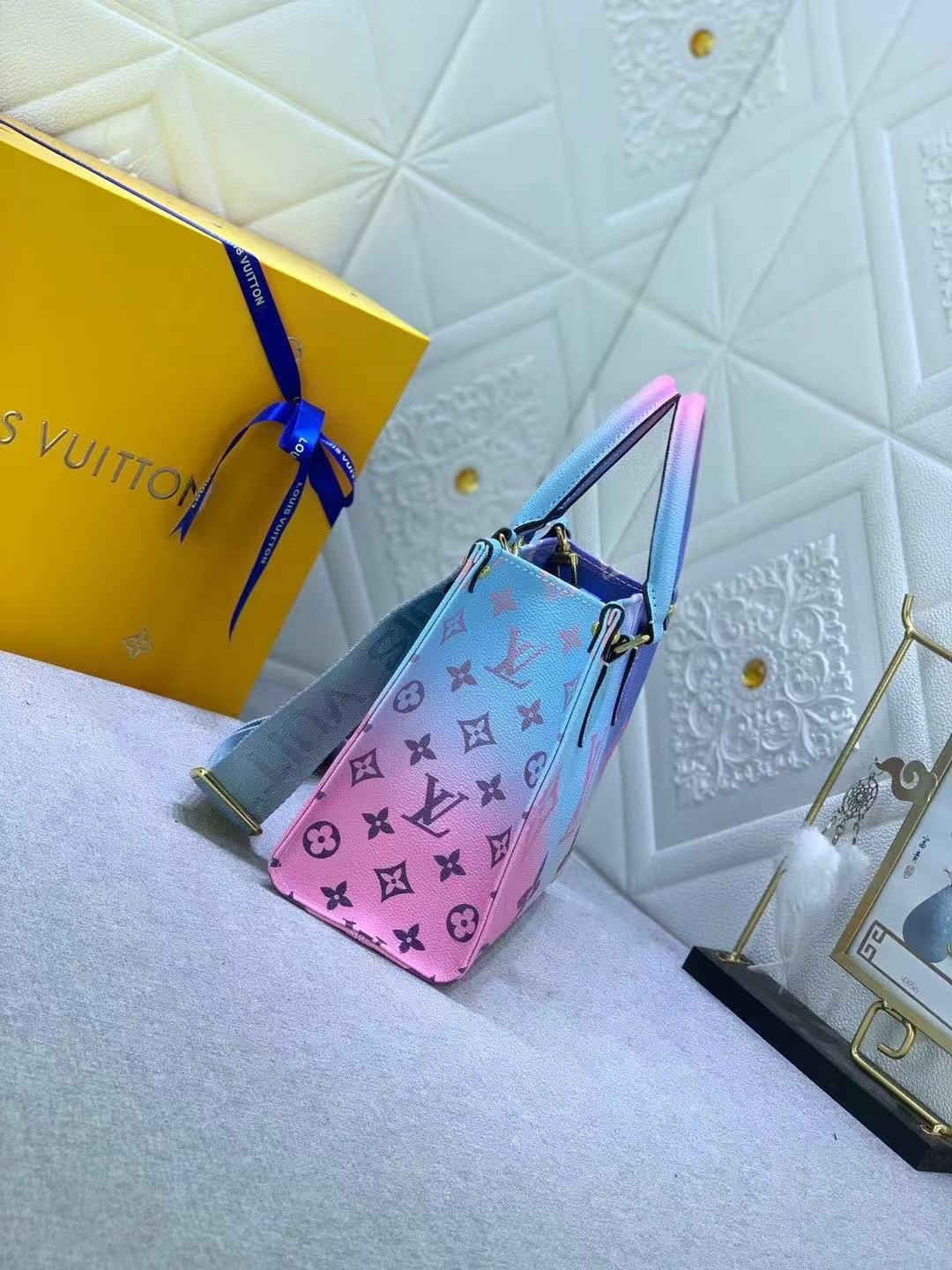 Characteristics:Fashioned from Monogram canvas in a new gradient pastel colorway, the OnTheGo PM tote brings a fresh touch to Spring silhouettes. This versatile bag offers many styling options, thanks to its cute detachable coin purse, removable jacquard strap, and two articulated Toron top handles. The most compact OnTheGo model, it easily holds a tablet, wallet and smartphone.