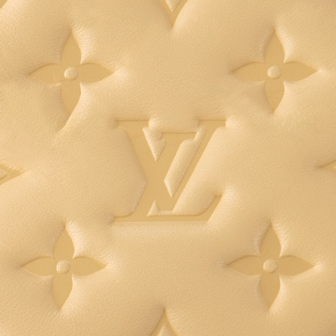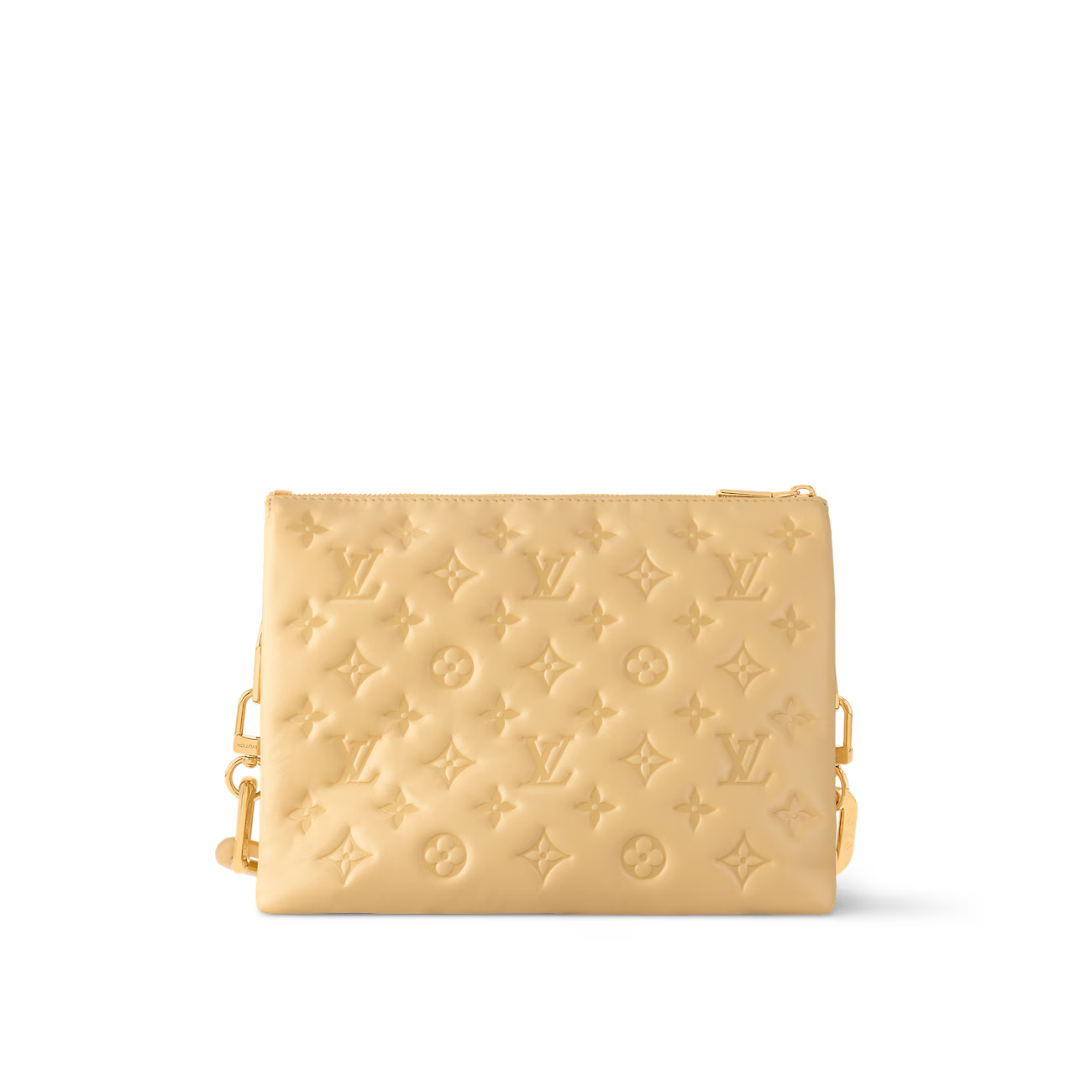 The Coussin PM is made from puffy lambskin, embossed with the Monogram, and features a chunky chain on which golden metallic links alternate with plexiglass links for a luminous touch of color. The Coussin has two inside compartments separated by an inside zipped pocket. In addition to the detachable chain, there is a wide removable strap.