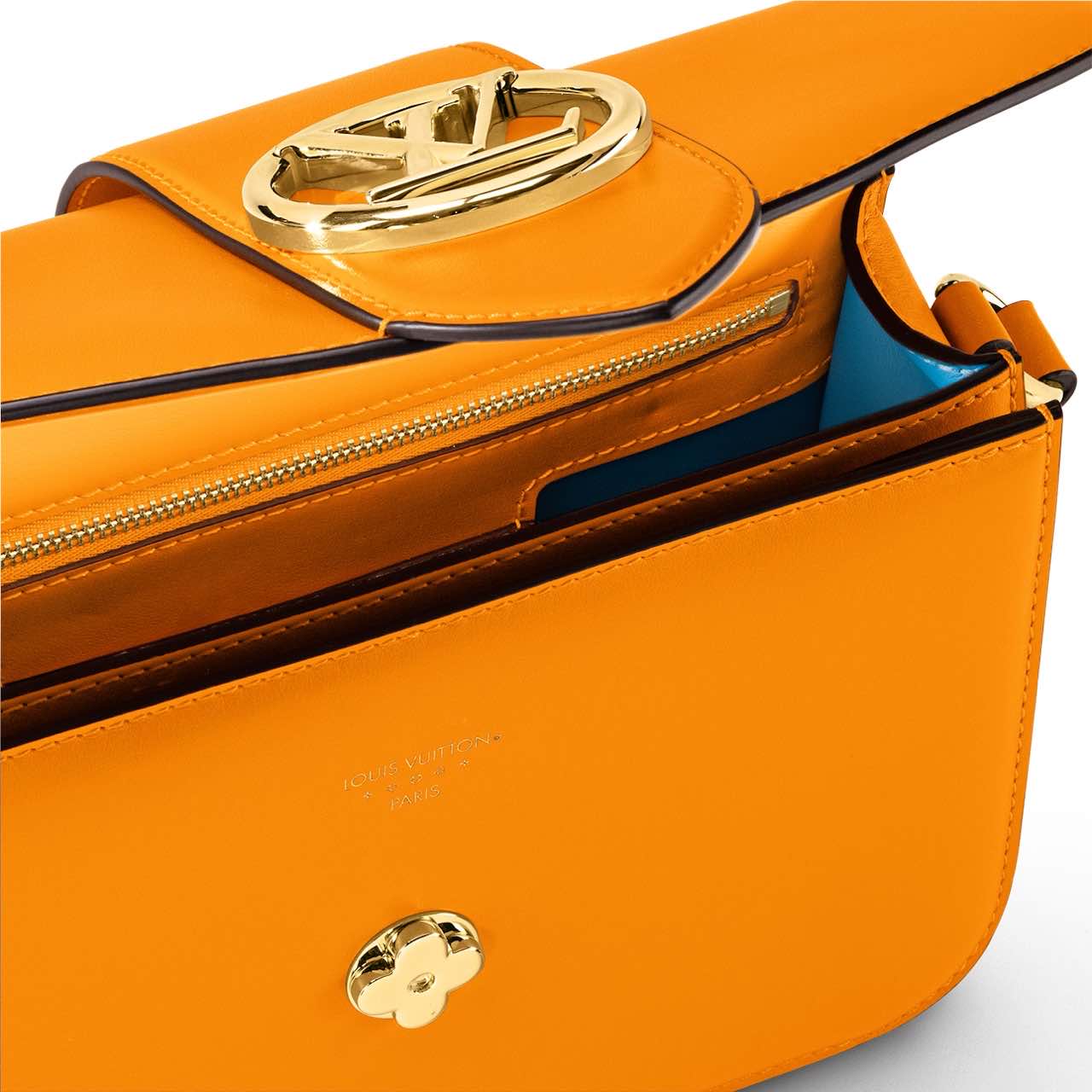 The structured yet curved lines of the L Pont 9 handbag are fashioned from smooth leather. The L Circle, a classic House signature reinterpreted by Nicolas Ghesquie?re, adorns the bag flap and the adjustable straps buckle. Hidden features such as a colored leather lining and Monogram Flower magnetic closure on the flaps underside bring subtle sophistication.
