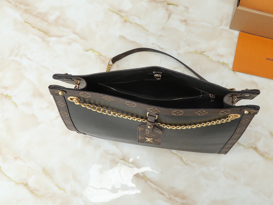Chain: Adjustable, non-detachable. Half chain length: 28.0 cm. Half chain length can be adjusted to 50.0 cm. The Monogram canvas trim features a fabric lining with metal hardware, and the internal patch pocket with the brand name can accommodate a laptop or A4 documents. Details: Length, Height, and Width