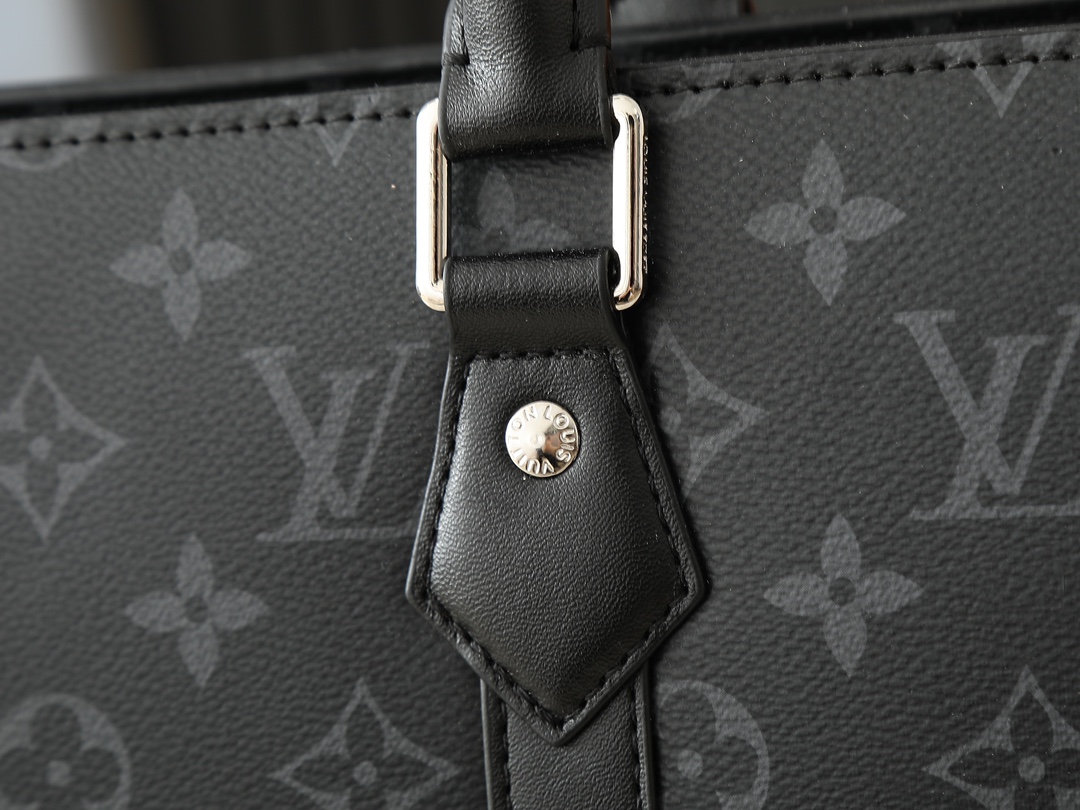 The Sac Plat 24H bag, crafted from elegant Monogram Eclipse coated canvas, features classic styling with side straps, handle fastenings, and a removable name tag. It boasts ample space for a zippered and patch pockets, one of which can accommodate a laptop, and features long and short handles for shoulder or hand carry.