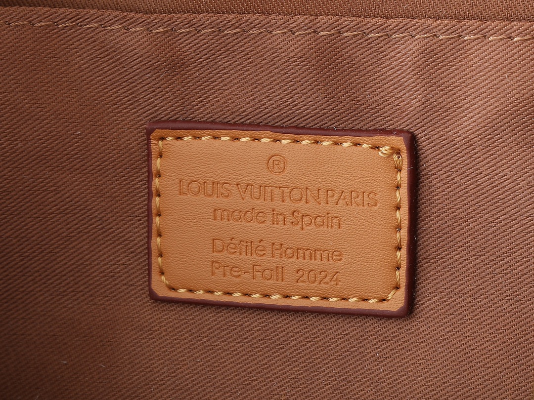 The Soul Trunk East West bag is crafted from Monogram Dust canvas and features reinforced metal corners, a nod to Pharrell Williams's heritage trunks. A magnetic closure provides easy access to the main compartment, while a detachable leather handle and a removable and adjustable shoulder strap allow for hand, shoulder, and crossbody carry.