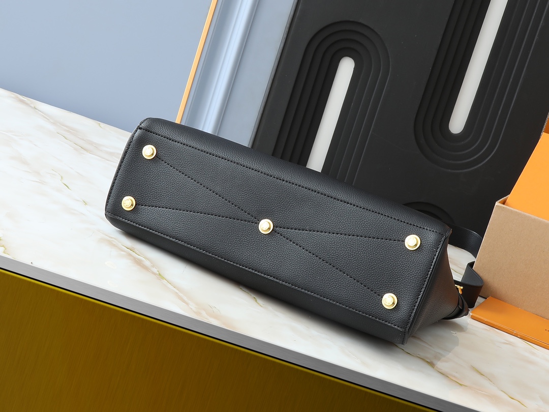 The Lock lt MM bag is crafted from fine grained Taurillon leather and smooth calfskin, with gold-finish buckle and hardware. Signature House touches include a padlock, key ring, and hot-stamped Louis Vuitton signature. With an articulated top handle and a removable strap, the bag offers versatile carrying options.