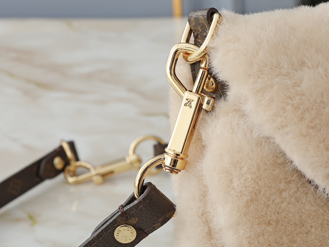 Crafted from soft shearling, this Sunset bag embodies the LV Ski Cozygram collection with a chic design. Lustrous hardware and Monogram details elevate a classic style, instantly elevating any winter look. Its spacious interior easily accommodates day and nighttime essentials, making it the perfect bag for relaxing after the ski season.