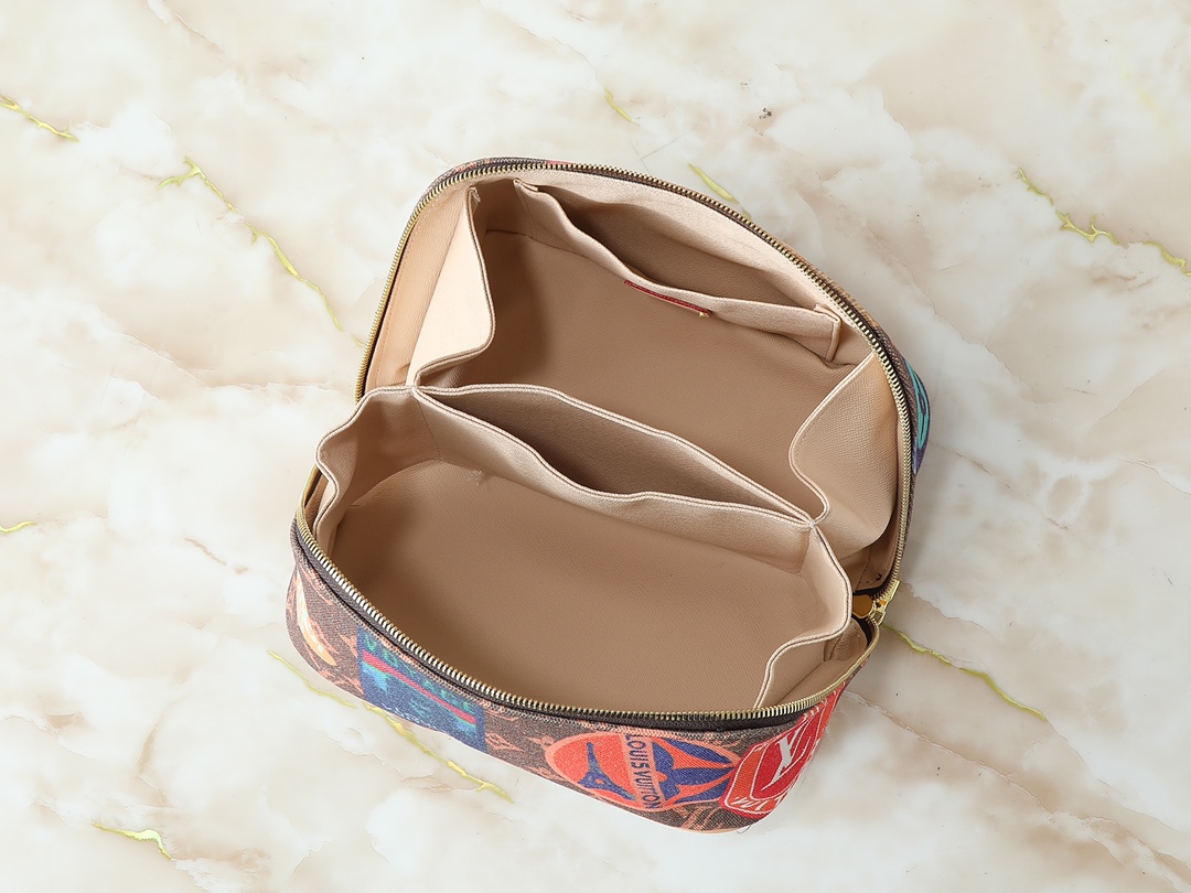 The Compartments toiletry bag is crafted from Monogram coated canvas with cowhide leather trim. It features Louis Vuitton travel stickers, a nod to turn-of-the-century travel fashion. The interior compartments offer effortless organization, while the double zipper closure adds functionality.