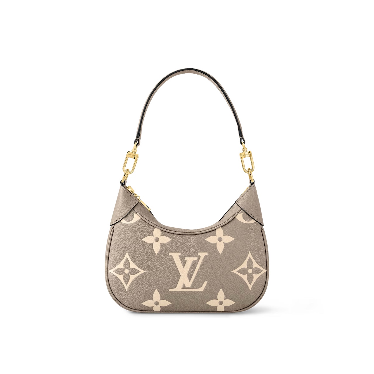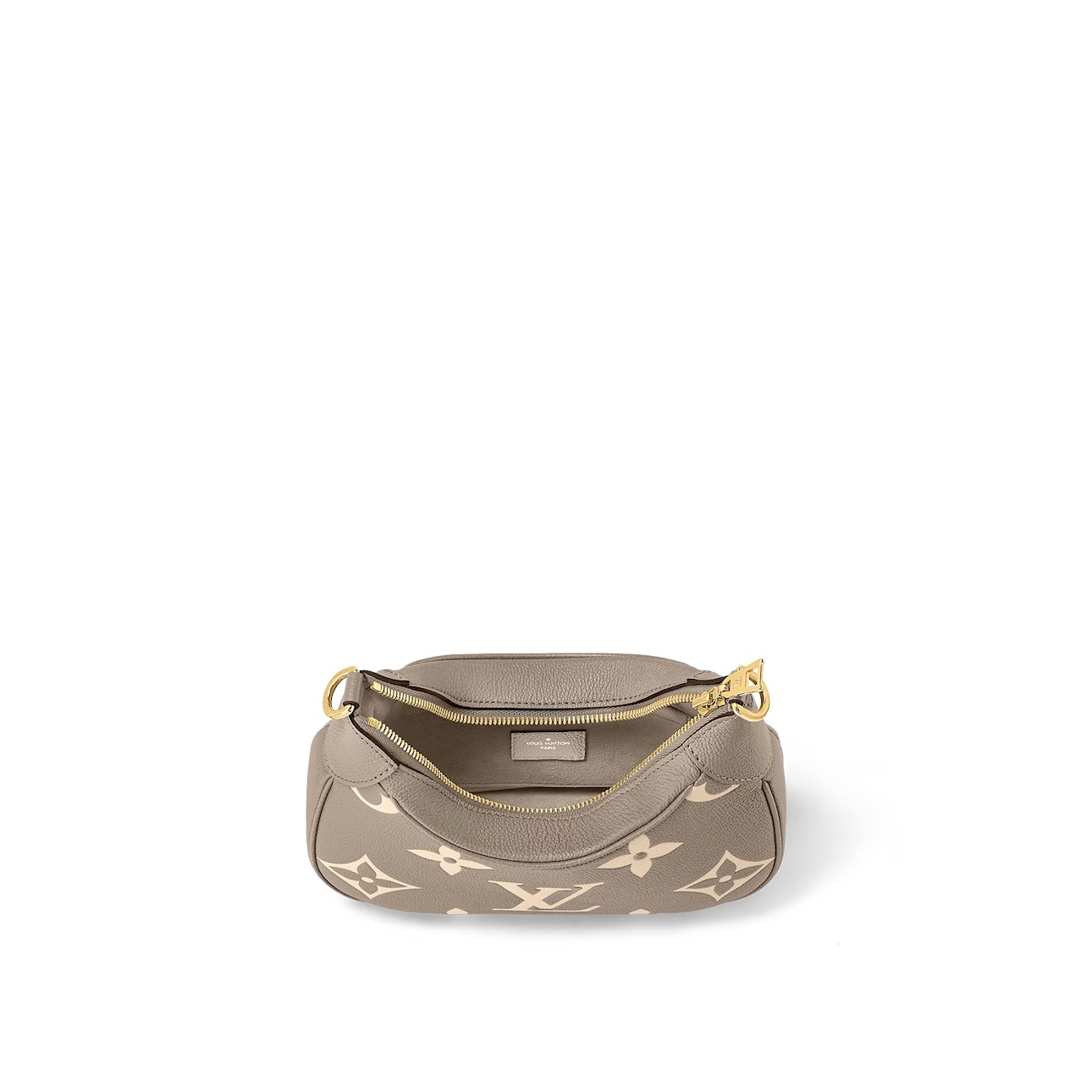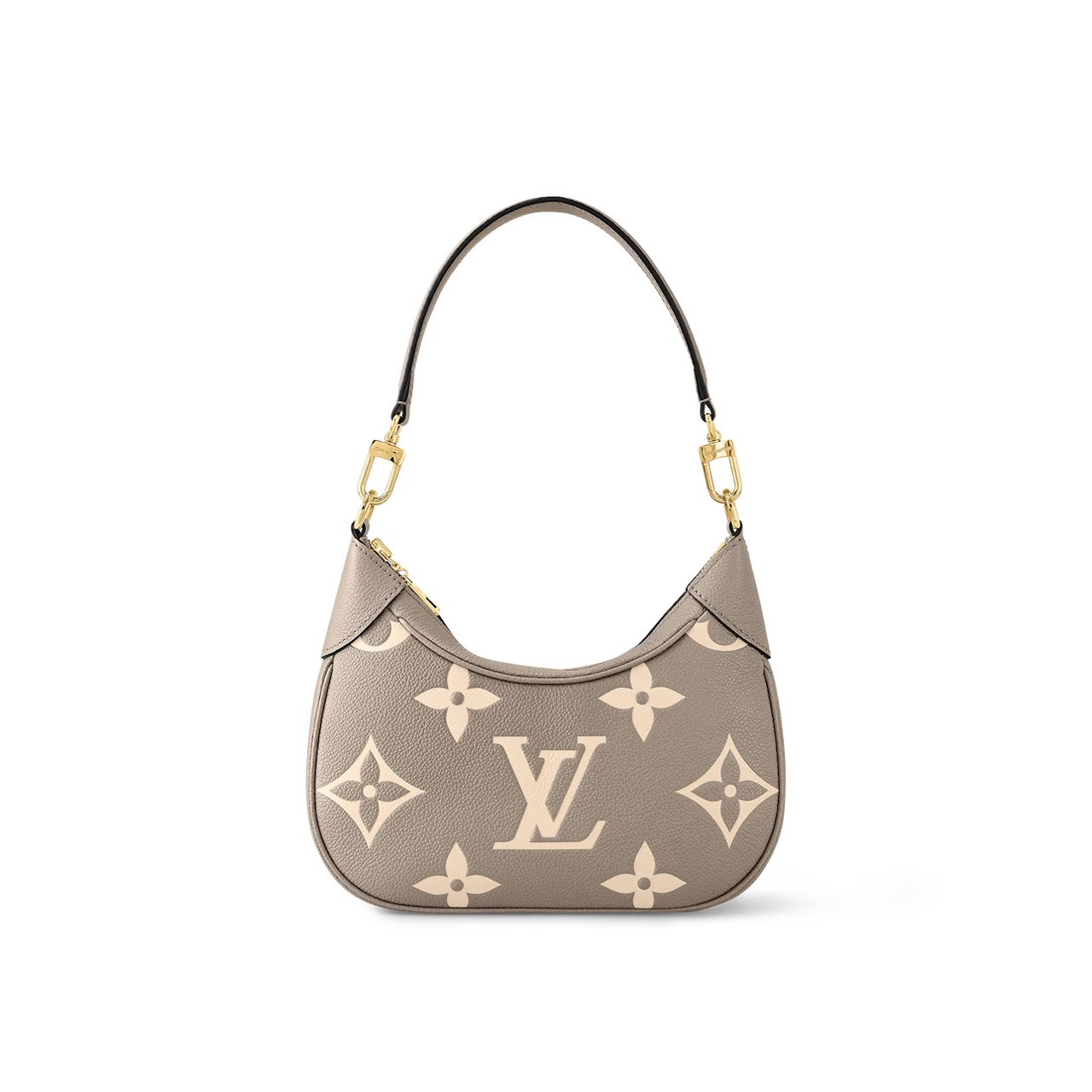 The Bagatelle mini hobo handbag is fashioned from supple, grained Monogram Empreinte leather. The embossed motif is oversized, the better to highlight the delicate color contrast of dove gray and cream. A graceful companion for any ensemble, it offers a host of stylish carry options thanks to the removable handle and detachable, adjustable strap.