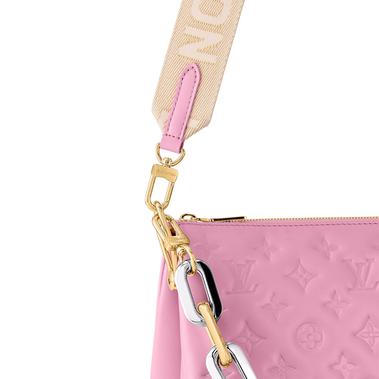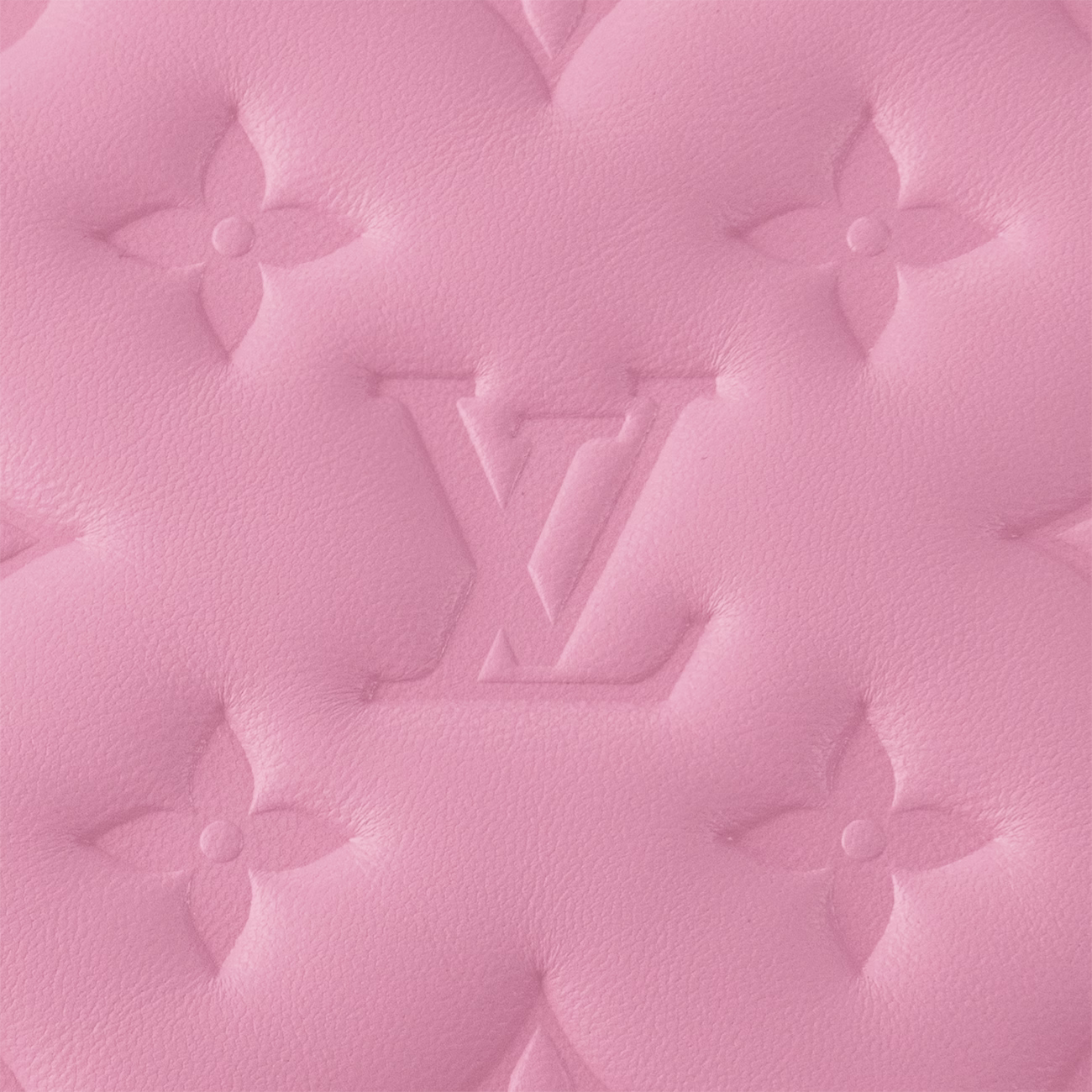 Offered this season in a fashionable candy-pink colorway, the Coussin PM is made from soft, puffy lambskin embossed with Monogram motifs. A new version of the chunky L chain combines gold with Monogram engraving - and siLer-finish links. For a casual-chic allure, the Coussin can be worn cross-body on the wide, removable textile strap.