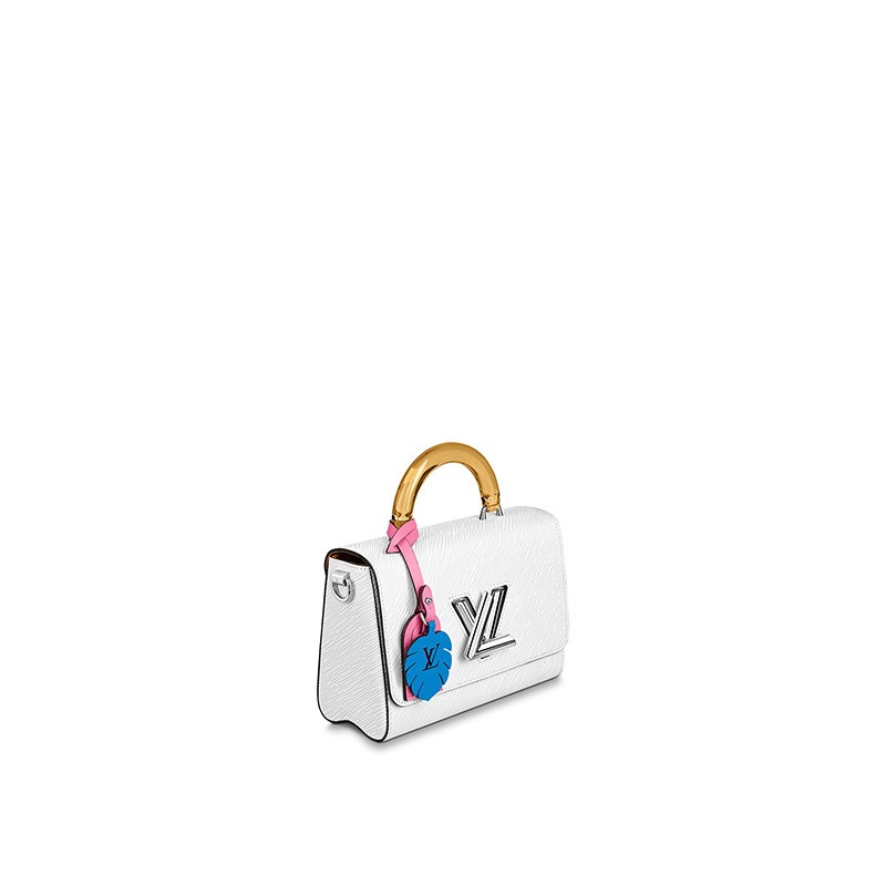 Transforming a classic bag into something bold and colorful for Summer 2020. L fashions the Twist MM in deep-dyed Epi leather with a colored plexiglass top handle and bright-colored nametag and charm. Accented by the classic Twist lock. the sheer top handle is associated with a removable leather strap for allow added carrying options.