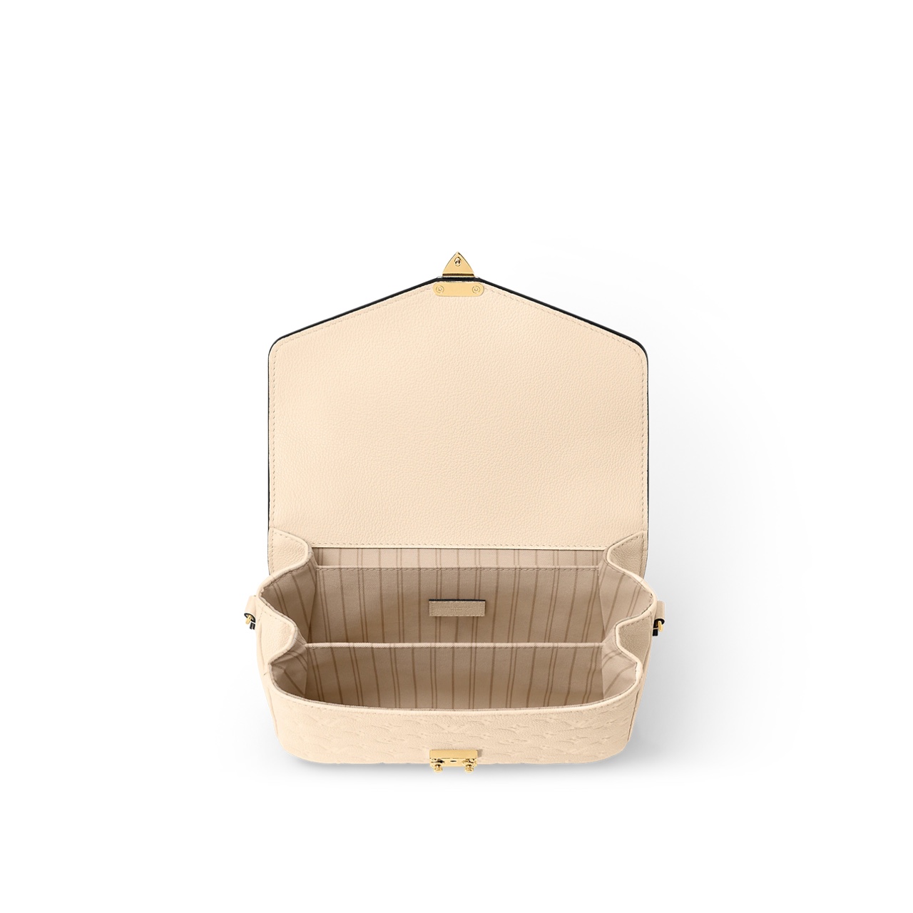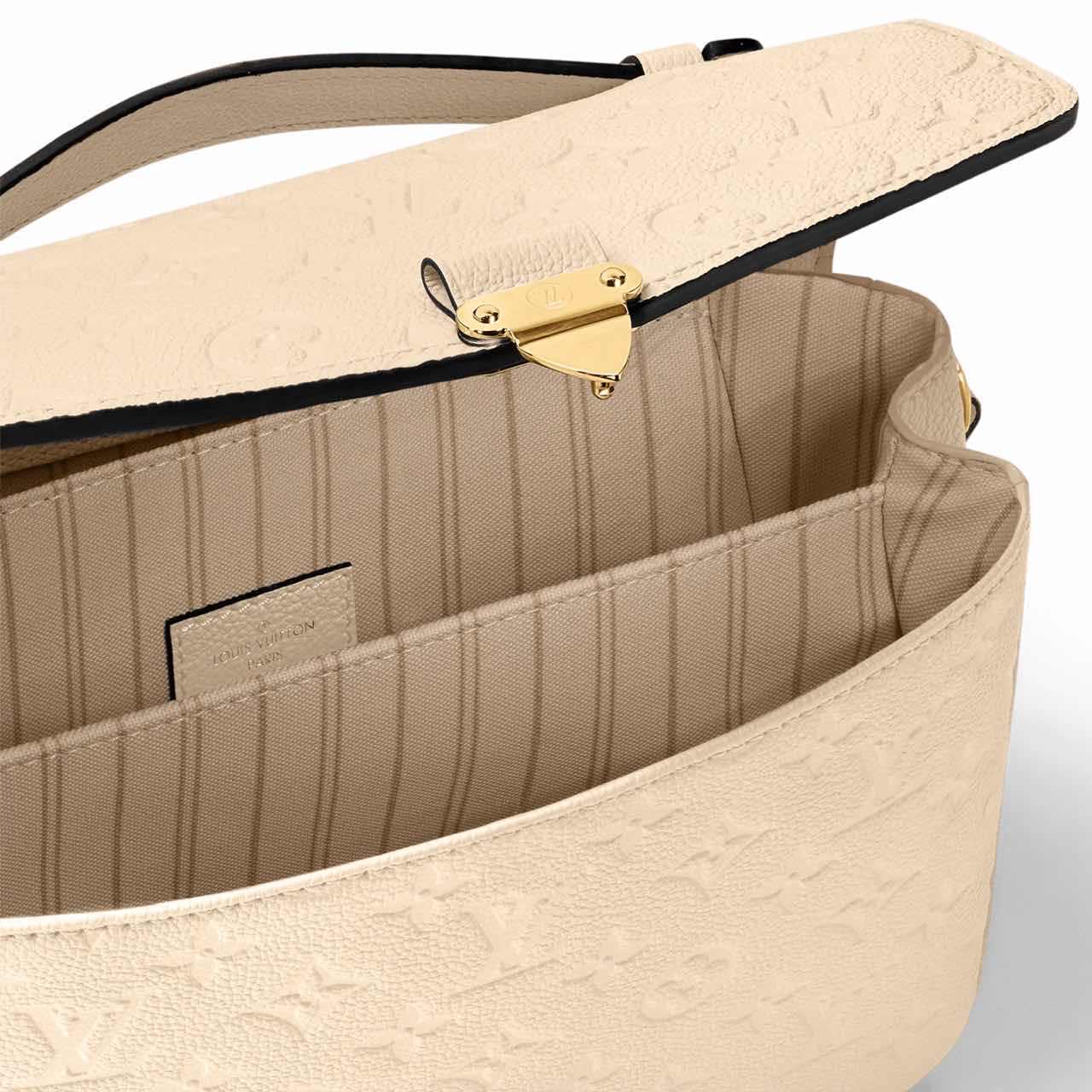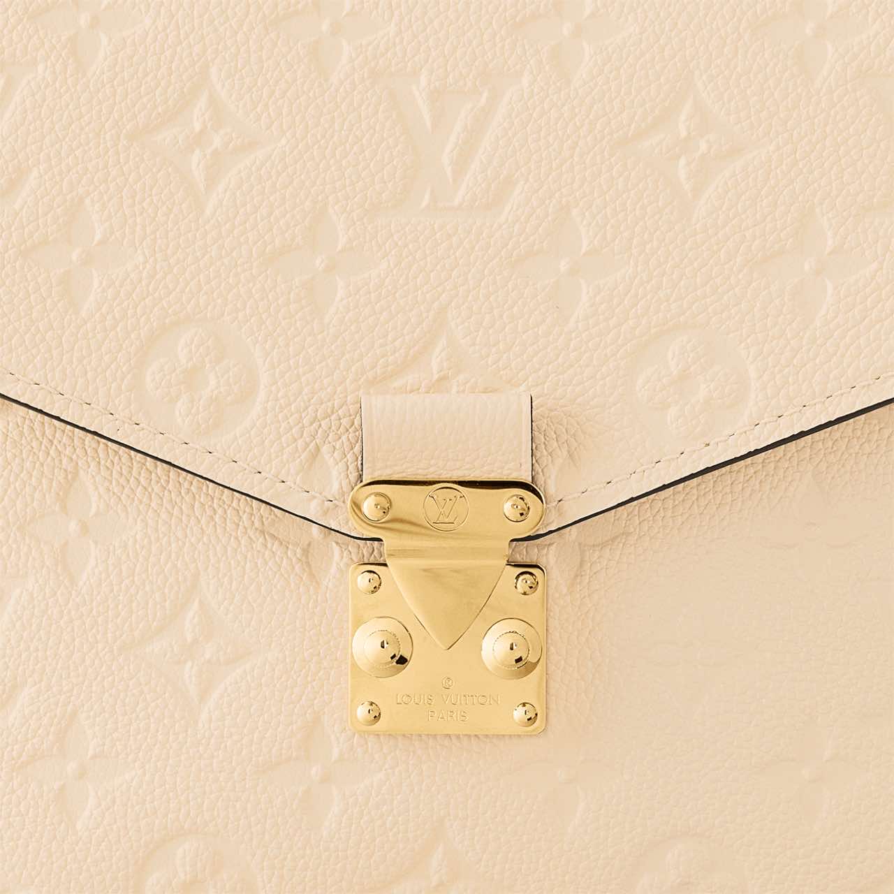 The Pochette Metis handbag, with its classic satchel silhouette, looks luminous in cream-color Monogram Empreinte leather with a matching microfiber lining. The discreet Monogram pattern embossed into the leather and the gold-color hardware, including the S-lock closure, give a modern elegance to this distinctive bag