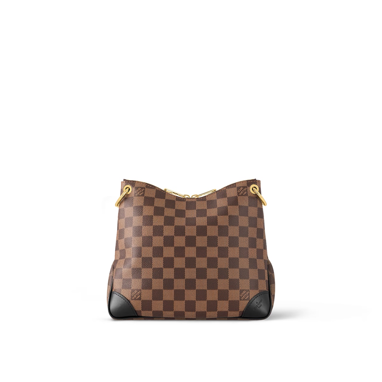 The elegant and body-friendly Odeon Tote PM bag is made from Damier Ebene canvas and finished with a luggage tag, top handles, and a removable strap, all in black leather. The roundness of the design and the sophisticated pleats bring a feminine feel. This smaller version of the Odeon Tote is the perfect casual chic alternative.